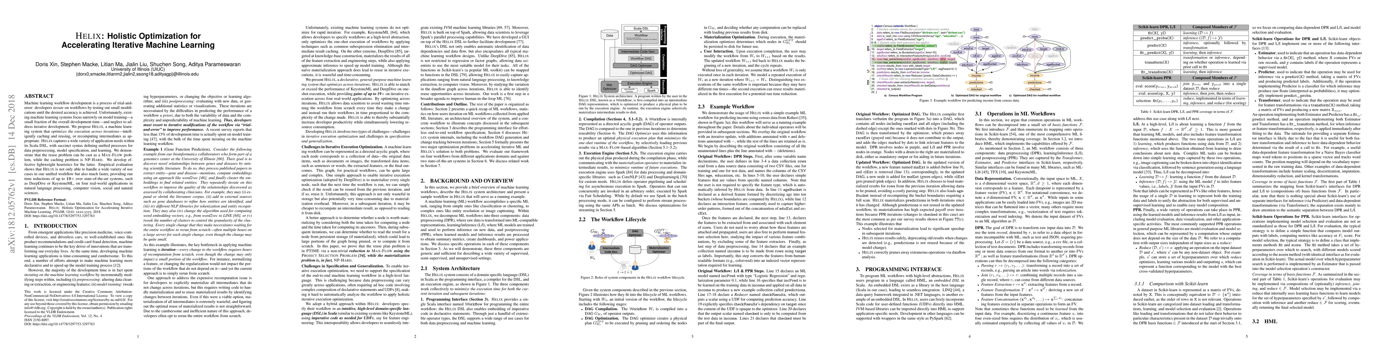 Machine learning workflow development is a process of trial-and-error: developers iterate on workflows by testing out small modifications until the desired accuracy is achieved. Unfortunately, existing machine learning systems focus narrowly on model training---a small fraction of the overall development time---and neglect to address iterative development. We propose Helix, a machine learning system that optimizes the execution across iterations---intelligently caching and reusing, or recomputing intermediates as appropriate. Helix captures a wide variety of application needs within its Scala DSL, with succinct syntax defining unified processes for data preprocessing, model specification, and learning. We demonstrate that the reuse problem can be cast as a Max-Flow problem, while the caching problem is NP-Hard. We develop effective lightweight heuristics for the latter. Empirical evaluation shows that Helix is not only able to handle a wide variety of use cases in one unified workflow but also much faster, providing run time reductions of up to 19x over state-of-the-art systems, such as DeepDive or KeystoneML, on four real-world applications in natural language processing, computer vision, social and natural sciences.