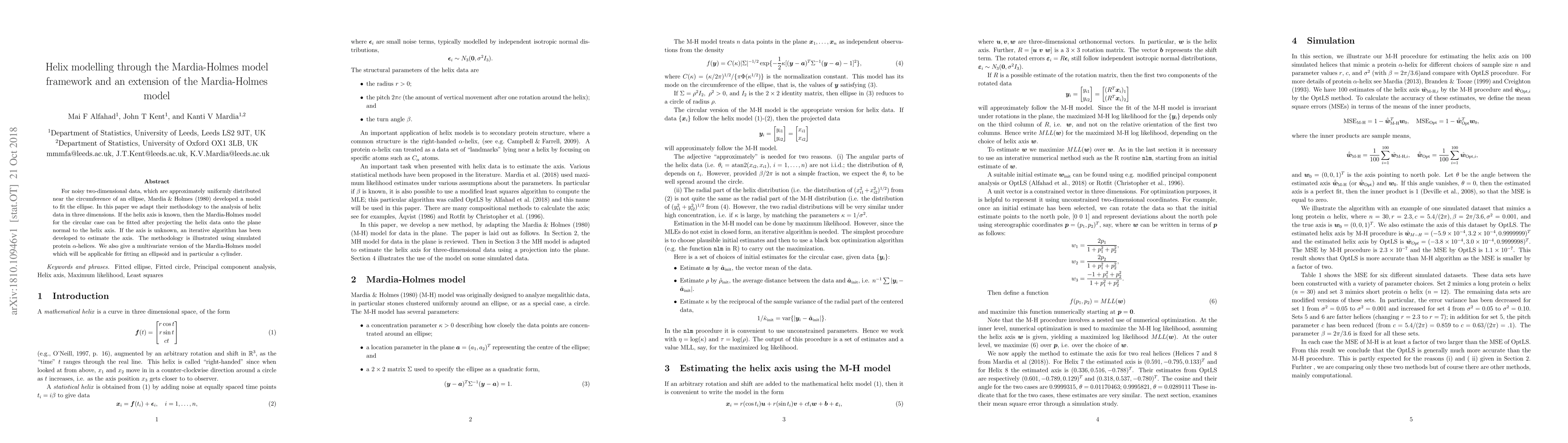 For noisy two-dimensional data, which are approximately uniformly distributed near the circumference of an ellipse, Mardia and Holmes (1980) developed a model to fit the ellipse. In this paper we adapt their methodology to the analysis of helix data in three dimensions. If the helix axis is known, then the Mardia-Holmes model for the circular case can be fitted after projecting the helix data onto the plane normal to the helix axis. If the axis is unknown, an iterative algorithm has been developed to estimate the axis. The methodology is illustrated using simulated protein alpha-helices. We also give a multivariate version of the Mardia-Holmes model which will be applicable for fitting an ellipsoid and in particular a cylinder.