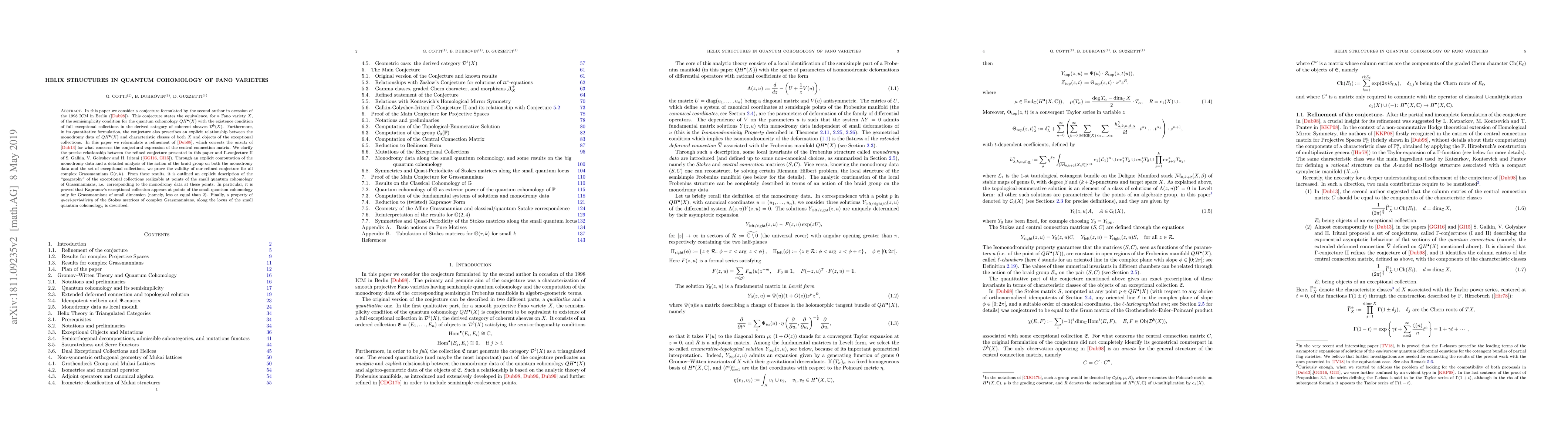 In this paper we consider a conjecture formulated by the second author in occasion of the 1998 ICM in Berlin (arXiv:math/9807034v2). This conjecture states the equivalence, for a Fano variety $X$, of the semisimplicity condition for the quantum cohomology $QH^\bullet(X)$ with the existence condition of full exceptional collections in the derived category of coherent sheaves $\mathcal D^b(X)$. Furthermore, in its quantitative formulation, the conjecture also prescribes an explicit relationship between the monodromy data of $QH^\bullet(X)$ and characteristic classes of both $X$ and objects of the exceptional collections. In this paper we reformulate a refinement of (arXiv:math/9807034v2), which corrects a previous ansatz (lecture of the second author at Strasbourg) for what concerns the conjectural expression of the central connection matrix. We clarify the precise relationship between the refined conjecture presented in this paper and $\Gamma$-conjecture II of S. Galkin, V. Golyshev and H. Iritani (arXiv:1404.6407v4, arXiv:1508.00719v3). Through an explicit computation of the monodromy data and a detailed analysis of the action of the braid group on both the monodromy data and the set of exceptional collections, we prove the validity of our refined conjecture for all complex Grassmannians $\mathbb G(r,k)$. From these results, it is outlined an explicit description of the "geography" of the exceptional collections realizable at points of the small quantum cohomology of Grassmannians, i.e. corresponding to the monodromy data at these points. In particular, it is proved that Kapranov's exceptional collection appears at points of the small quantum cohomology only for Grassmannians of small dimension (namely, less or equal than 2). Finally, a property of quasi-periodicity of the Stokes matrices of complex Grassmannians, along the locus of the small quantum cohomology, is described.