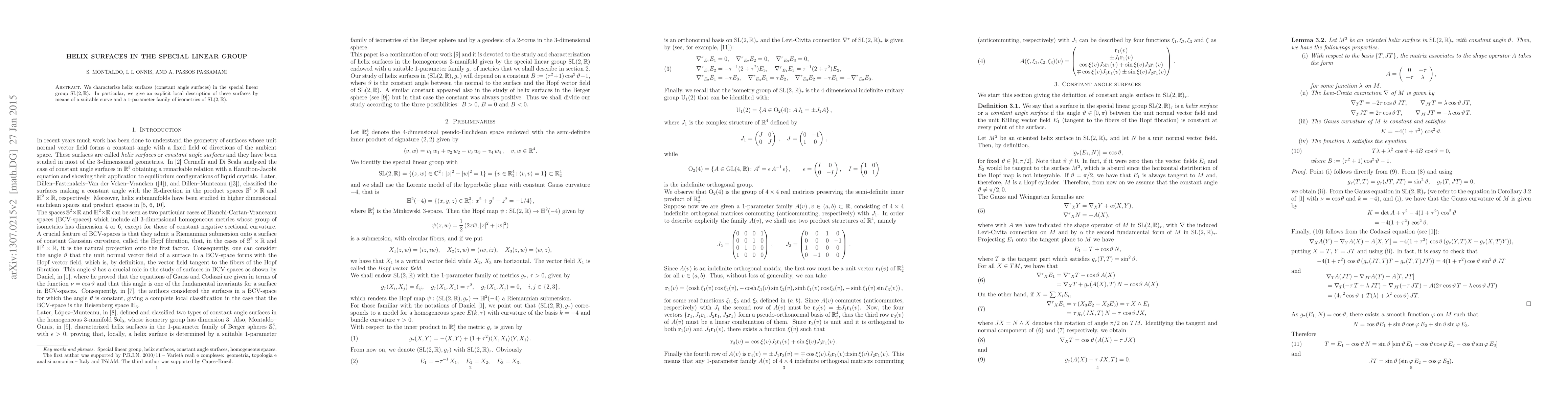 This paper characterizes helix surfaces in the special linear group $\mathrm{SL}(2,\r)$, providing an explicit local description through a curve and a 1-parameter family of isometries. The focus is on constant angle surfaces within this group.