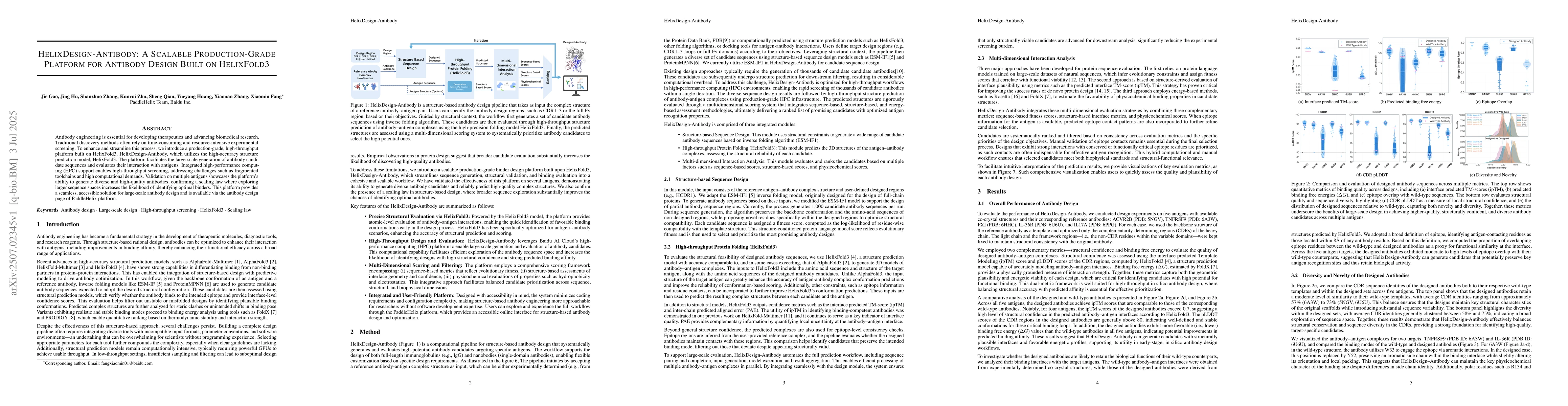 Antibody engineering is essential for developing therapeutics and advancing biomedical research. Traditional discovery methods often rely on time-consuming and resource-intensive experimental screening. To enhance and streamline this process, we introduce a production-grade, high-throughput platform built on HelixFold3, HelixDesign-Antibody, which utilizes the high-accuracy structure prediction model, HelixFold3. The platform facilitates the large-scale generation of antibody candidate sequences and evaluates their interaction with antigens. Integrated high-performance computing (HPC) support enables high-throughput screening, addressing challenges such as fragmented toolchains and high computational demands. Validation on multiple antigens showcases the platform's ability to generate diverse and high-quality antibodies, confirming a scaling law where exploring larger sequence spaces increases the likelihood of identifying optimal binders. This platform provides a seamless, accessible solution for large-scale antibody design and is available via the antibody design page of PaddleHelix platform.