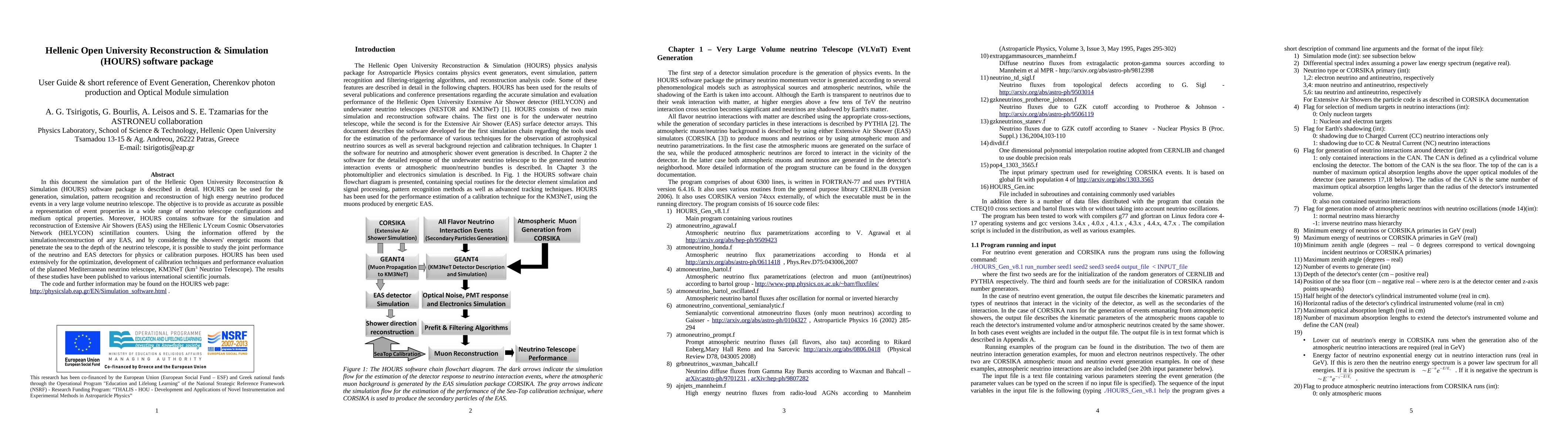 In this document the simulation part of the Hellenic Open University Reconstruction & Simulation (HOURS) software package is described in detail. HOURS can be used for the generation, simulation, pattern recognition and reconstruction of high energy neutrino produced events in a very large volume neutrino telescope. The objective is to provide as accurate as possible a representation of event properties in a wide range of neutrino telescope configurations and medium optical properties. Moreover, HOURS contains software for the simulation and reconstruction of Extensive Air Showers (EAS) using the HEllenic LYceum Cosmic Observatories Network (HELYCON) scintillation counters. Using the information offered by the simulation/reconstruction of any EAS, and by considering the showers' energetic muons that penetrate the sea to the depth of the neutrino telescope, it is possible to study the joint performance of the neutrino and EAS detectors for physics or calibration purposes. HOURS has been used extensively for the optimization, development of calibration techniques and performance evaluation of the planned Mediterranean neutrino telescope, KM3NeT (km 3 Neutrino Telescope). The results of these studies have been published to various international scientific journals. The code and further information may be found on the HOURS web page: http://physicslab.eap.gr/EN/Simulation_software.html .