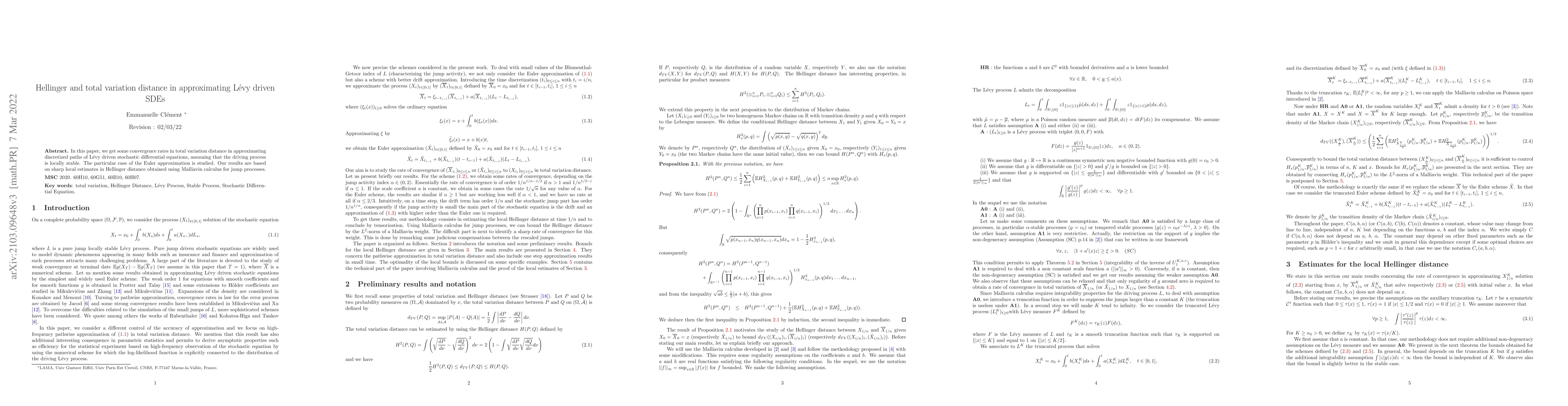 This paper investigates convergence rates in total variation distance for discretized paths of Lévy-driven SDEs, focusing on the Euler approximation. The study leverages sharp local estimates in Hellinger distance derived via Malliavin calculus for jump processes, assuming local stability of the driving process.