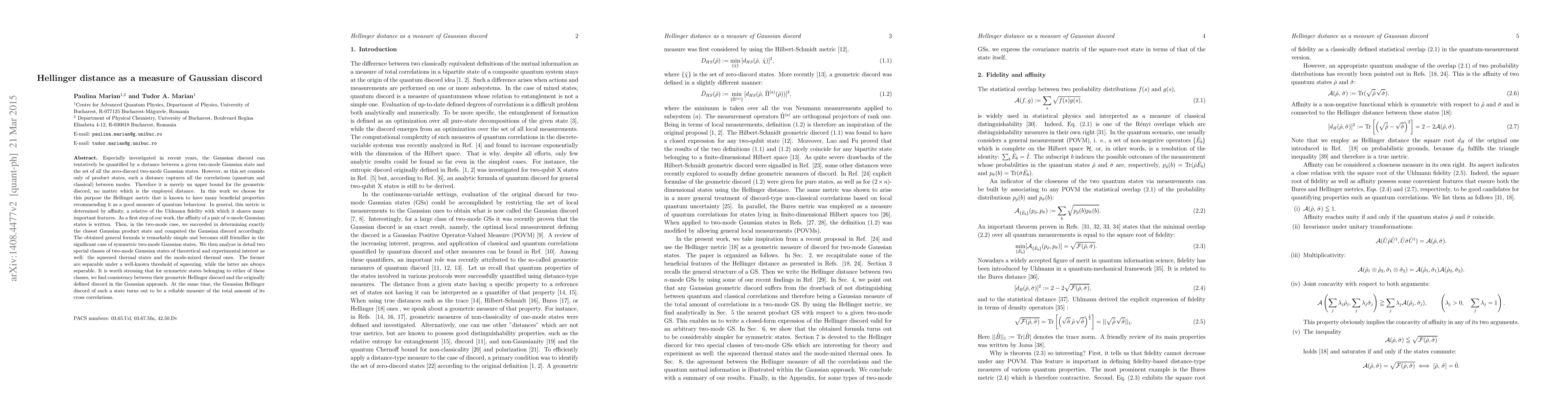This paper investigates the Gaussian discord using the Hellinger distance, demonstrating that it captures all correlations in two-mode Gaussian states. The authors derive a simple formula for Gaussian discord in the two-mode case, particularly for symmetric states, and show consistency with geometric discord for special classes like squeezed thermal and mode-mixed thermal states.