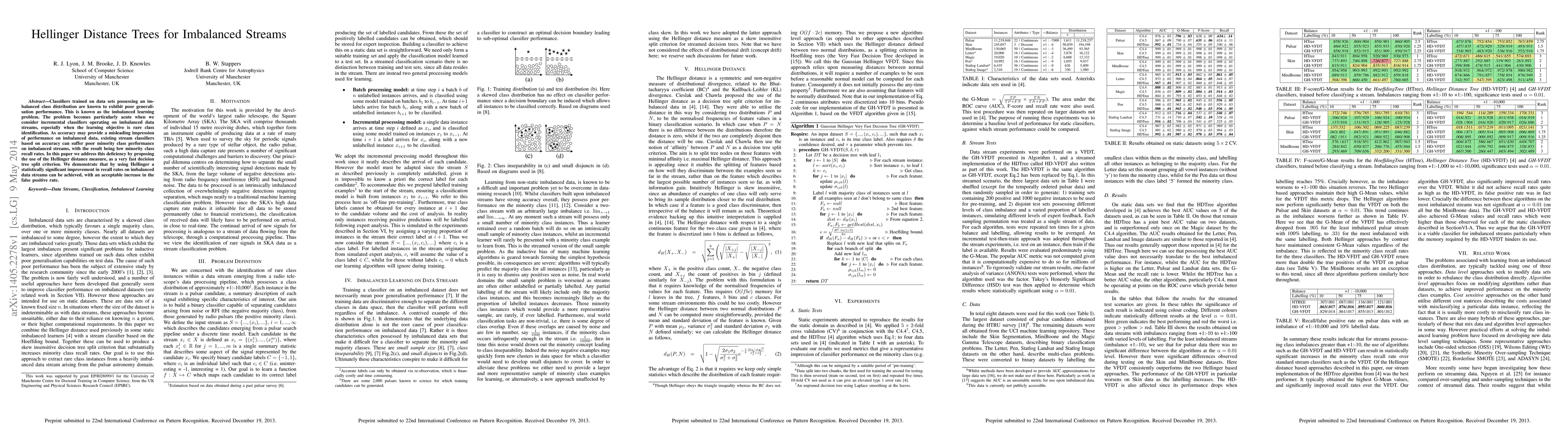 This paper proposes using Hellinger distance in decision trees as a split criterion for classifiers handling imbalanced data streams, showing significant improvements in minority class recall rates with a manageable increase in false positives.