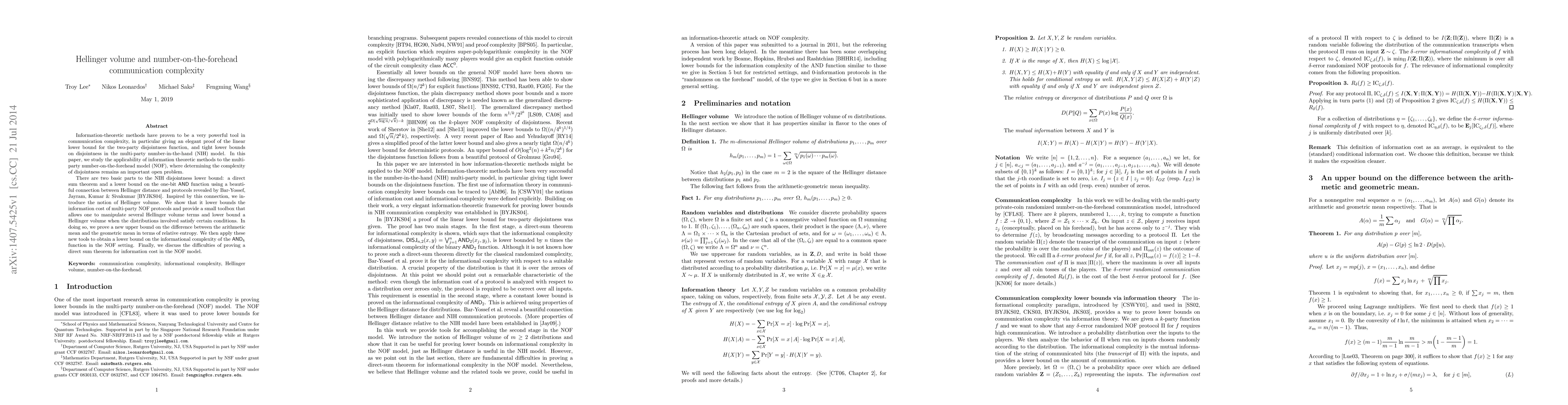 This paper explores the application of information-theoretic methods, specifically Hellinger volume, to the multi-party number-on-the-forehead (NOF) communication complexity model. It introduces a new upper bound on the difference between the arithmetic mean and geometric mean in terms of relative entropy and applies these tools to derive a lower bound on the informational complexity of the AND_k function in the NOF setting.