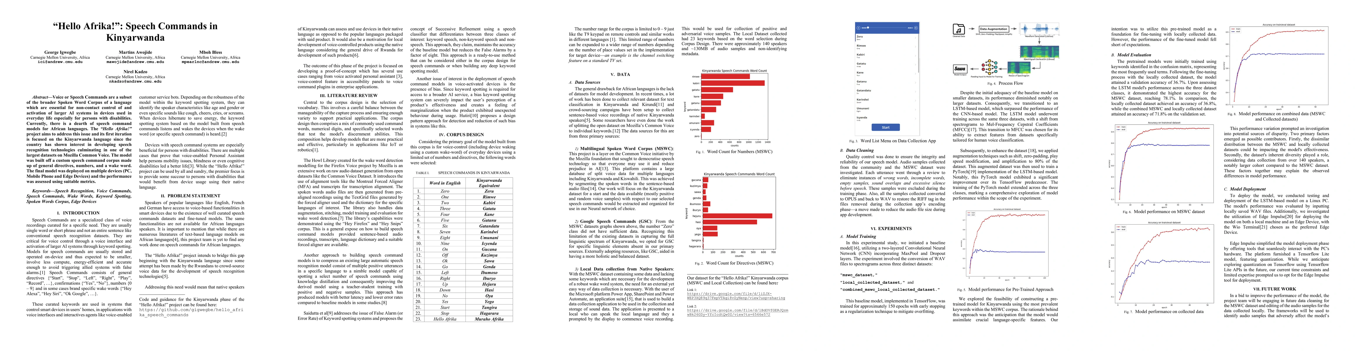 Voice or Speech Commands are a subset of the broader Spoken Word Corpus of a language which are essential for non-contact control of and activation of larger AI systems in devices used in everyday life especially for persons with disabilities. Currently, there is a dearth of speech command models for African languages. The Hello Afrika project aims to address this issue and its first iteration is focused on the Kinyarwanda language since the country has shown interest in developing speech recognition technologies culminating in one of the largest datasets on Mozilla Common Voice. The model was built off a custom speech command corpus made up of general directives, numbers, and a wake word. The final model was deployed on multiple devices (PC, Mobile Phone and Edge Devices) and the performance was assessed using suitable metrics.