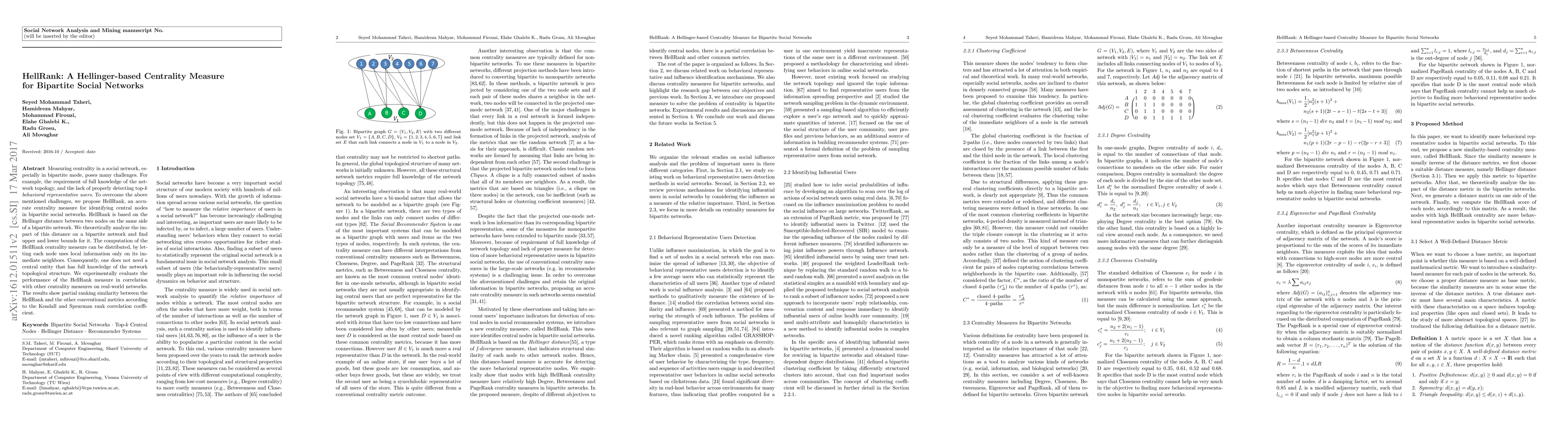 Measuring centrality in a social network, especially in bipartite mode, poses several challenges such as requirement of full knowledge of the network topology and lack of properly detection of top-k behavioral representative users. In this paper, to overcome the aforementioned challenging issues, we propose an accurate centrality measure, called HellRank, to identify central nodes in bipartite social networks. HellRank is based on the Hellinger distance between two nodes on the same side of a bipartite network. We theoretically analyze the impact of the Hellinger distance on a bipartite network and find an upper and lower bounds for this distance. The computation of HellRank centrality measure can be distributed by letting each node uses only local information on its immediate neighbors and therefore do not need a central entity to have full knowledge of the network topological structure. We experimentally evaluate performance of the HellRank measure in correlation with other centrality measures on real-world networks. The results show partial ranking similarity between the HellRank and the other conventional metrics according to the Kendall and Spearman rank correlation coefficient.