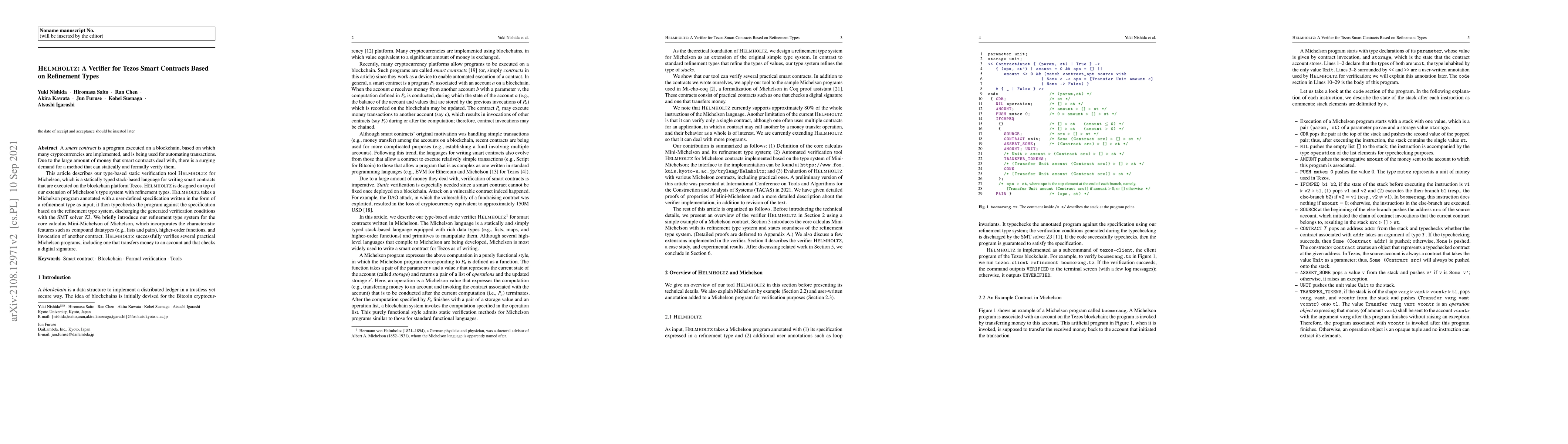 The introduction of HELMHOLTZ, a verifier for Tezos smart contracts based on refinement types, enabling static verification of Michelson programs against user-defined specifications.