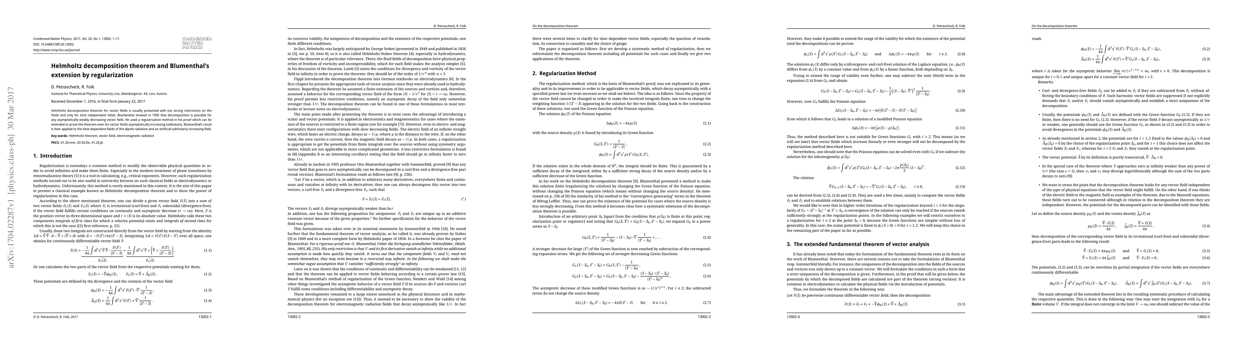 Helmholtz decomposition theorem for vector fields is usually presented with too strong restrictions on the fields and only for time independent fields. Blumenthal showed in 1905 that decomposition is possible for any asymptotically weakly decreasing vector field. He used a regularization method in his proof which can be extended to prove the theorem even for vector fields asymptotically increasing sublinearly. Blumenthal's result is then applied to the time-dependent fields of the dipole radiation and an artificial sublinearly increasing field.