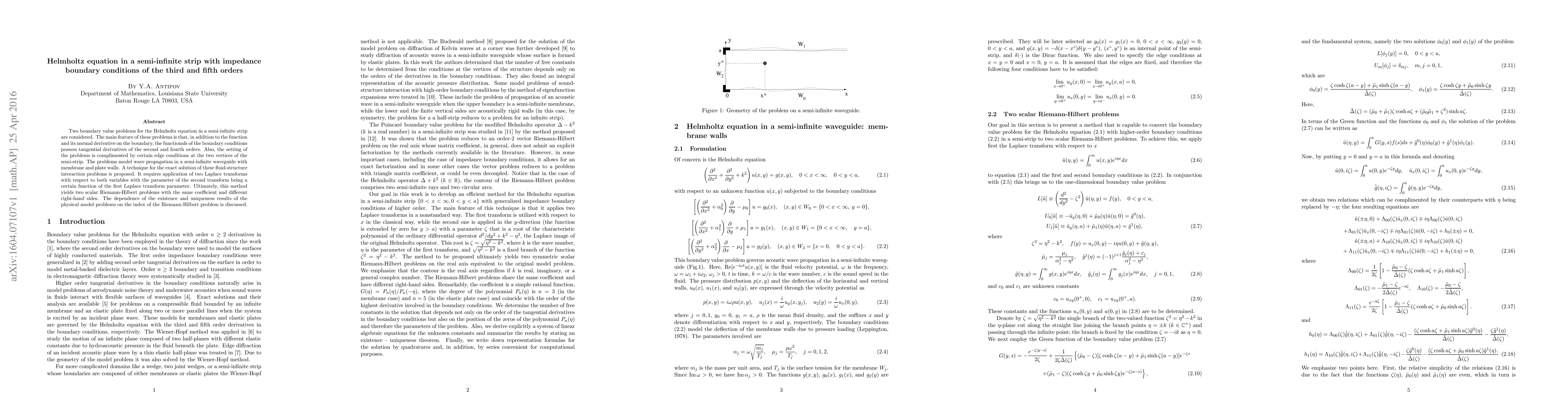 This paper addresses two boundary value problems for the Helmholtz equation in a semi-infinite strip with impedance boundary conditions involving high-order tangential derivatives. The proposed solution technique uses two Laplace transforms and results in scalar Riemann-Hilbert problems, with discussions on the existence and uniqueness of solutions based on the Riemann-Hilbert index.