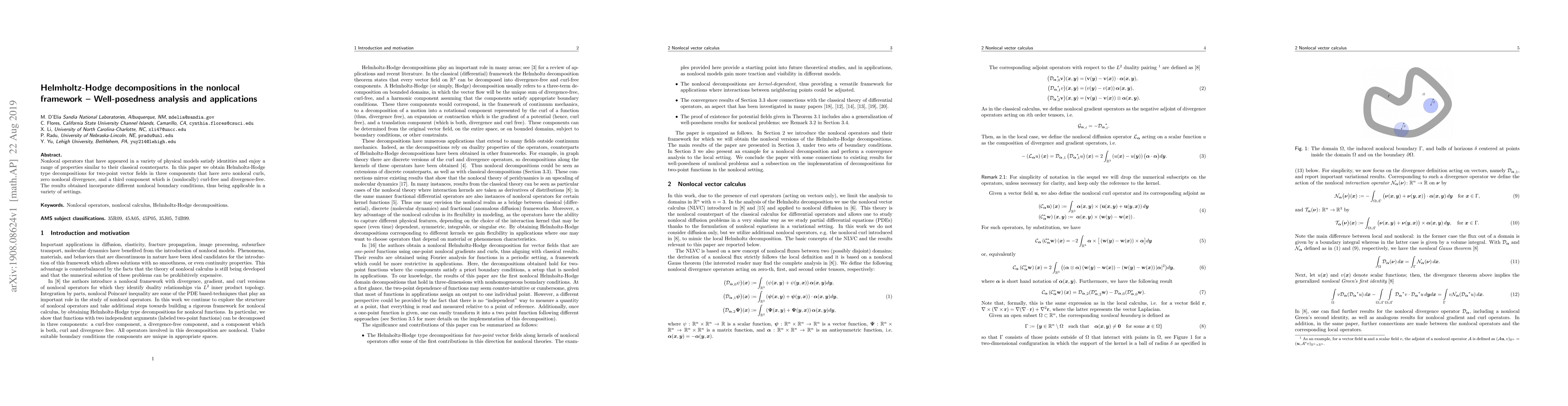 This paper develops Helmholtz-Hodge decompositions for two-point vector fields in three components under nonlocal conditions, including zero nonlocal curl and divergence, and a curl-free, divergence-free component. The analysis covers various nonlocal boundary conditions, enhancing applicability across different physical models.