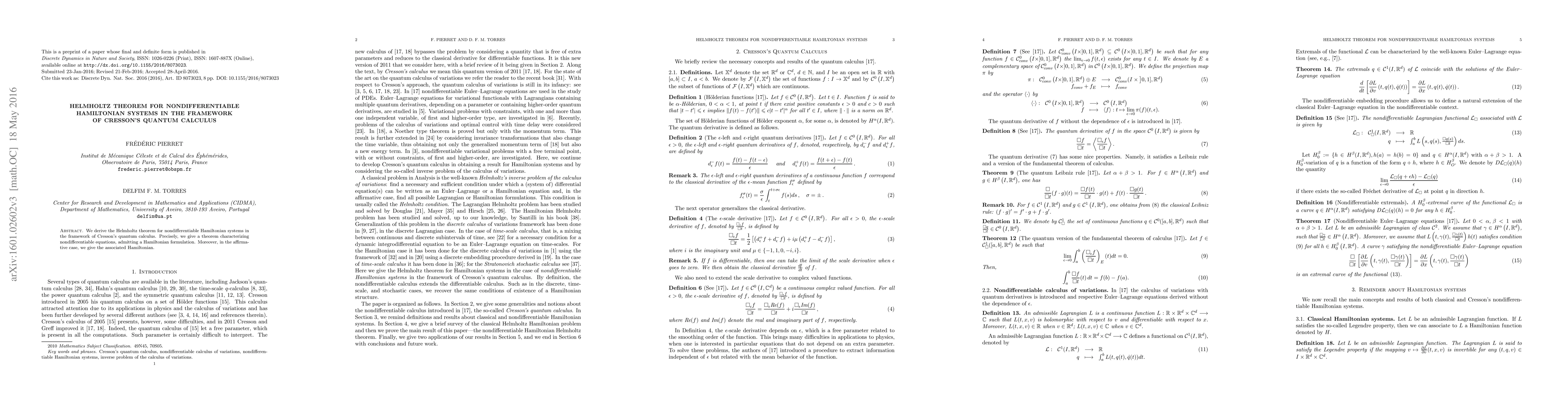 This paper derives the Helmholtz theorem for nondifferentiable Hamiltonian systems using Cresson's quantum calculus, providing a characterization of such systems and, when applicable, the corresponding Hamiltonian.
