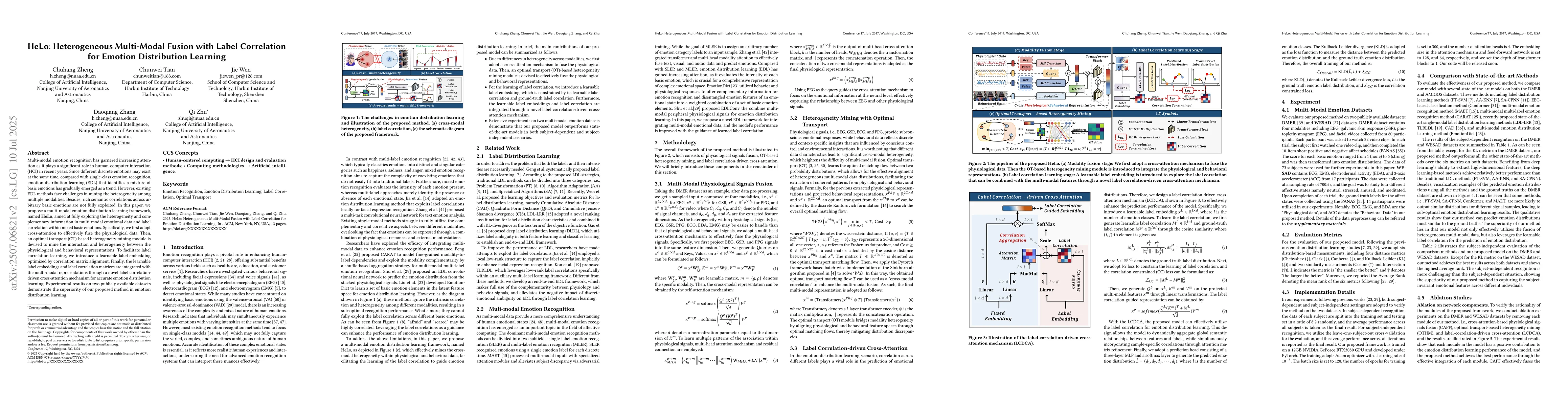 Multi-modal emotion recognition has garnered increasing attention as it plays a significant role in human-computer interaction (HCI) in recent years. Since different discrete emotions may exist at the same time, compared with single-class emotion recognition, emotion distribution learning (EDL) that identifies a mixture of basic emotions has gradually emerged as a trend. However, existing EDL methods face challenges in mining the heterogeneity among multiple modalities. Besides, rich semantic correlations across arbitrary basic emotions are not fully exploited. In this paper, we propose a multi-modal emotion distribution learning framework, named HeLo, aimed at fully exploring the heterogeneity and complementary information in multi-modal emotional data and label correlation within mixed basic emotions. Specifically, we first adopt cross-attention to effectively fuse the physiological data. Then, an optimal transport (OT)-based heterogeneity mining module is devised to mine the interaction and heterogeneity between the physiological and behavioral representations. To facilitate label correlation learning, we introduce a learnable label embedding optimized by correlation matrix alignment. Finally, the learnable label embeddings and label correlation matrices are integrated with the multi-modal representations through a novel label correlation-driven cross-attention mechanism for accurate emotion distribution learning. Experimental results on two publicly available datasets demonstrate the superiority of our proposed method in emotion distribution learning.