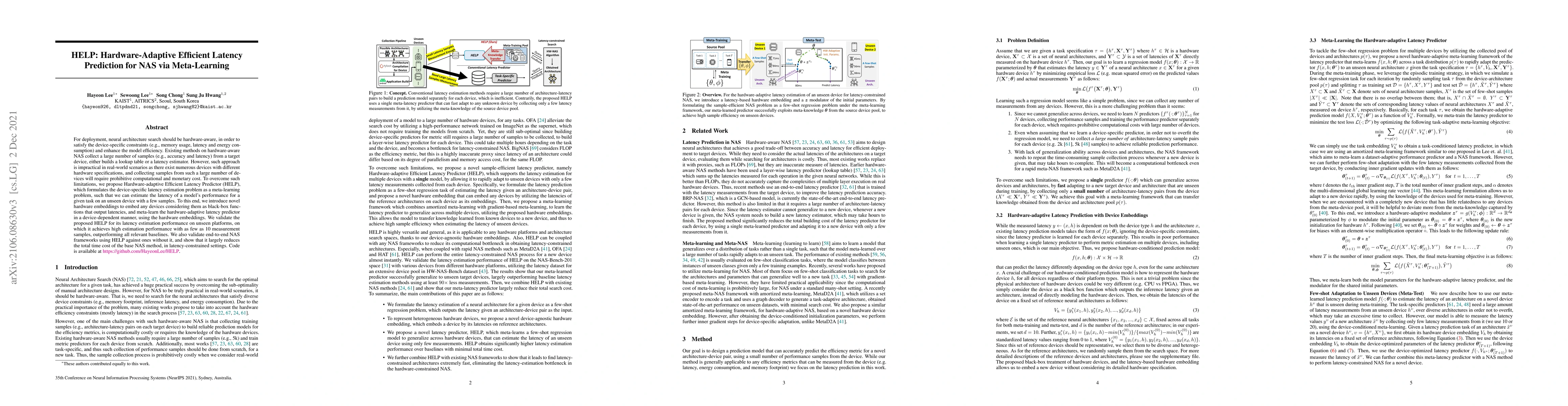The paper proposes HELP, a meta-learning approach for efficient latency prediction in neural architecture search (NAS) that minimizes the need for extensive device-specific data collection. HELP leverages hardware embeddings and meta-learning to accurately estimate model performance on unseen devices with minimal samples, significantly reducing the time cost of NAS in latency-constrained settings.
