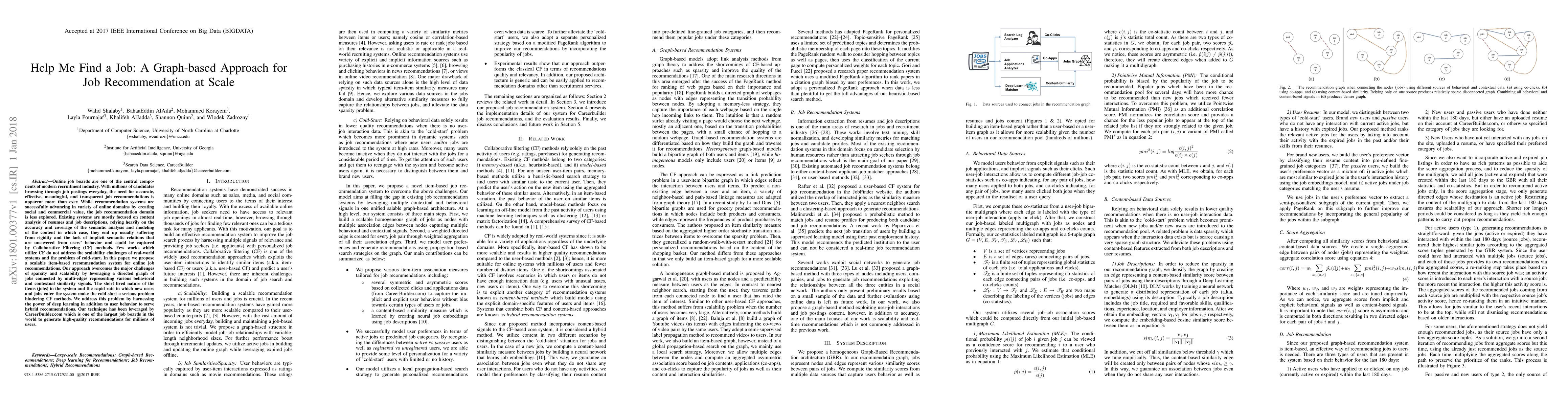 This paper proposes a scalable graph-based recommendation system for job recommendations, addressing sparsity and scalability issues through a directed graph of jobs linked by behavioral and contextual similarity. It combines deep learning with user behavior to tackle the cold-start problem, and has been successfully implemented by CareerBuilder.com to provide high-quality job recommendations for millions of users.