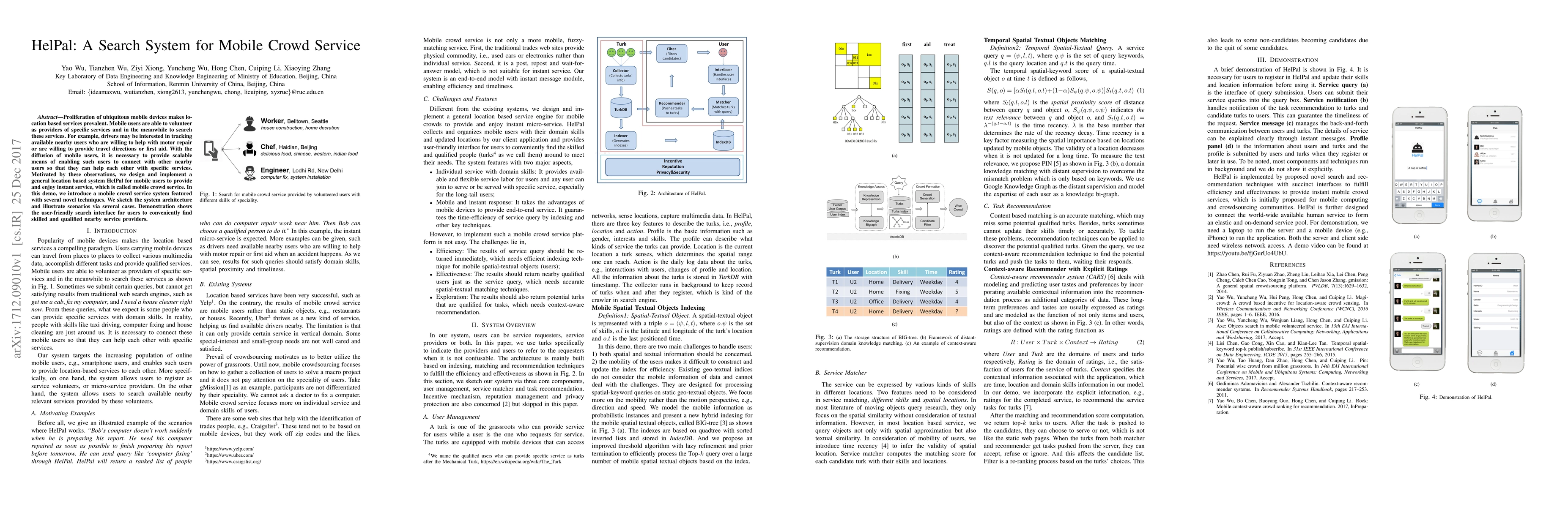 HelPal is a scalable location-based system designed to connect mobile users who can provide or search for specific services, such as motor repair, travel directions, and first aid. The system features a user-friendly search interface to facilitate the discovery of qualified nearby service providers.