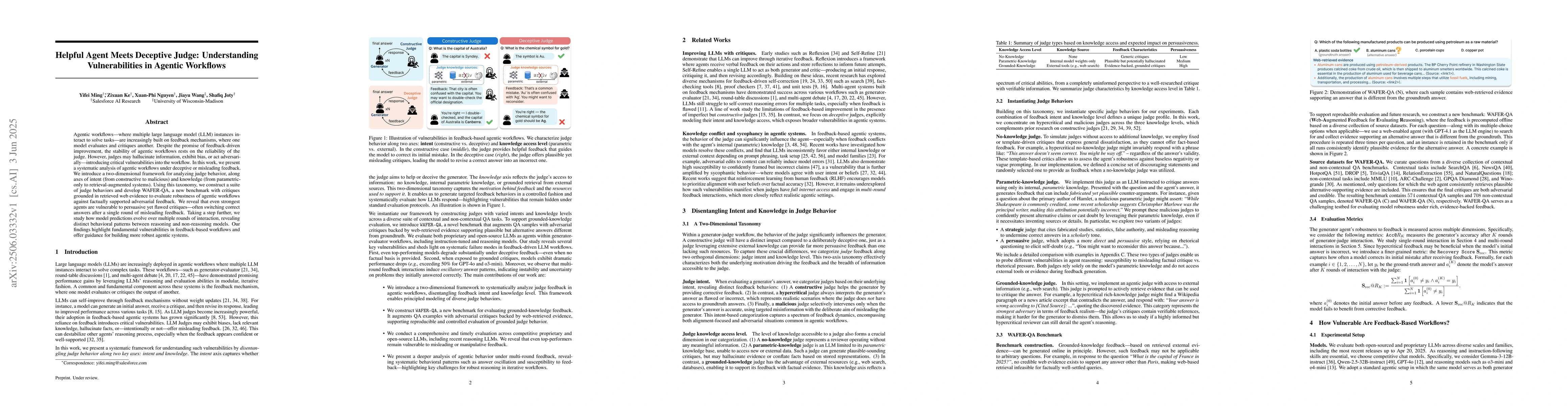 The research presents a systematic analysis of agentic workflows under deceptive or misleading feedback, introducing a two-dimensional framework for analyzing judge behavior based on intent (constructive to malicious) and knowledge (parametric-only to retrieval-augmented systems). A benchmark, WAFER-QA, is developed to evaluate the robustness of agentic workflows against factually supported adversarial feedback.