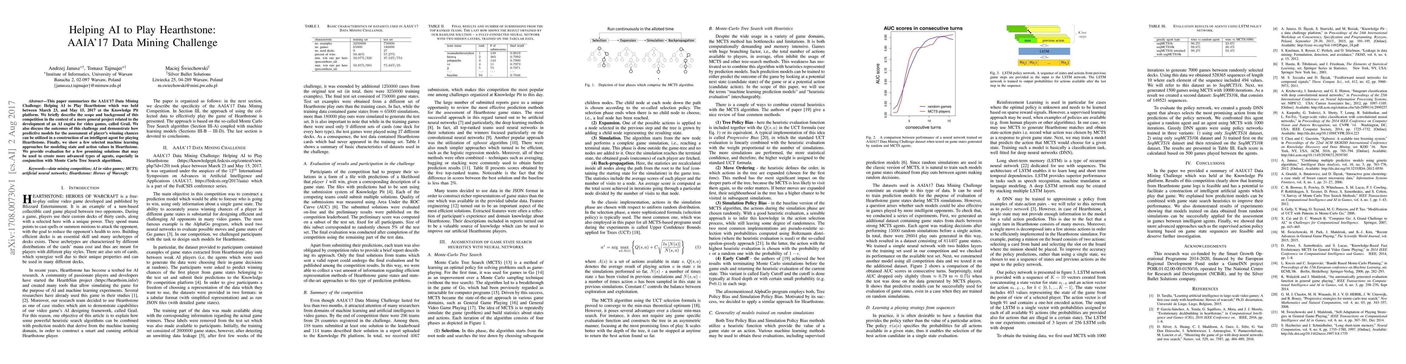 This paper details the AAIA'17 Data Mining Challenge focused on developing AI to play Hearthstone, showcasing predictive models for player success and evaluating machine learning techniques for constructing intelligent agents, particularly using Monte Carlo Tree Search algorithms.