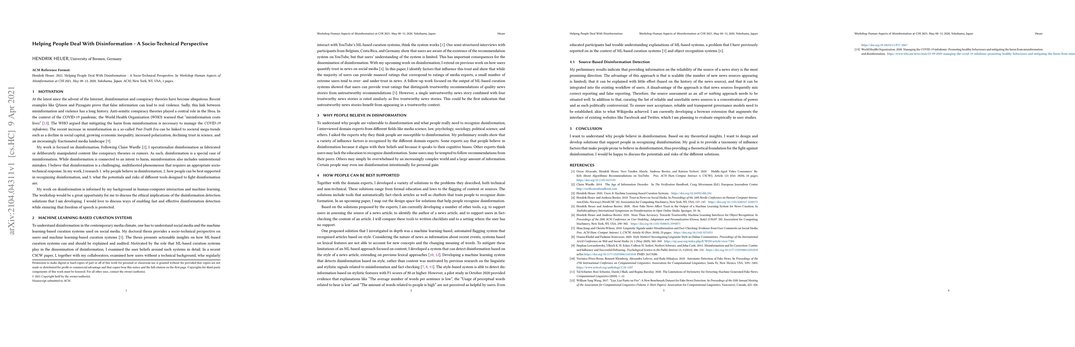 At the latest since the advent of the Internet, disinformation and conspiracy theories have become ubiquitous. Recent examples like QAnon and Pizzagate prove that false information can lead to real violence. In this motivation statement for the Workshop on Human Aspects of Misinformation at CHI 2021, I explain my research agenda focused on 1. why people believe in disinformation, 2. how people can be best supported in recognizing disinformation, and 3. what the potentials and risks of different tools designed to fight disinformation are.