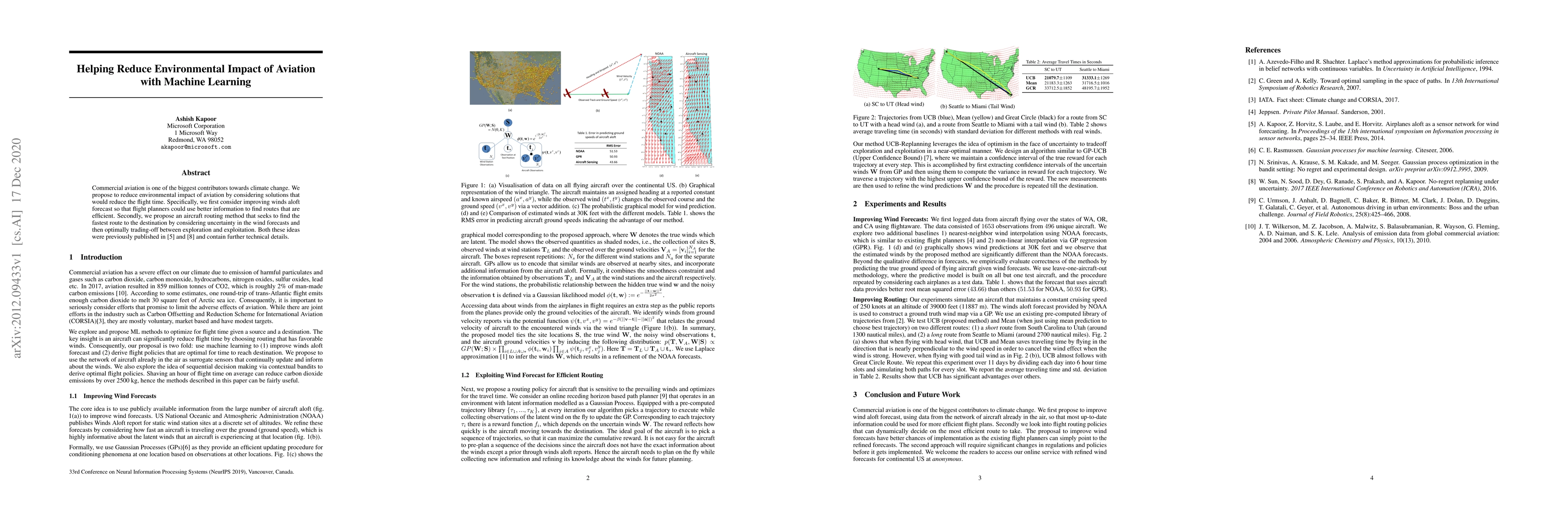 Commercial aviation is one of the biggest contributors towards climate change. We propose to reduce environmental impact of aviation by considering solutions that would reduce the flight time. Specifically, we first consider improving winds aloft forecast so that flight planners could use better information to find routes that are efficient. Secondly, we propose an aircraft routing method that seeks to find the fastest route to the destination by considering uncertainty in the wind forecasts and then optimally trading-off between exploration and exploitation.