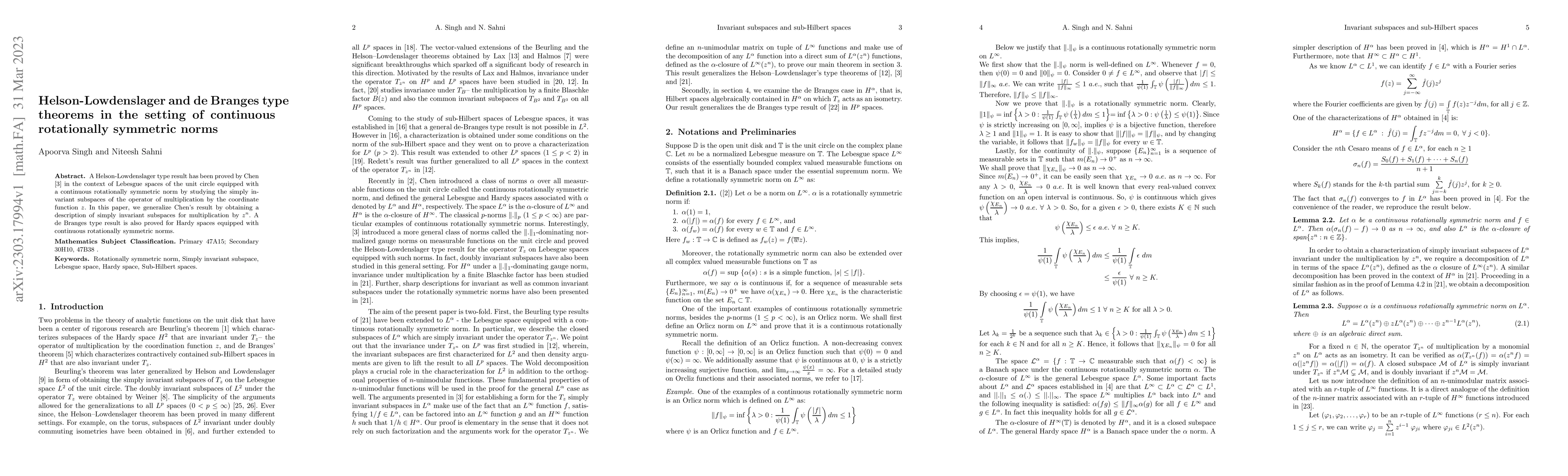 This paper generalizes Chen's Helson-Lowdenslager theorem for Lebesgue spaces on the unit circle with continuous rotationally symmetric norms, focusing on simply invariant subspaces of multiplication by $z^n$. Additionally, it establishes a de Branges type result for Hardy spaces under the same norm conditions.