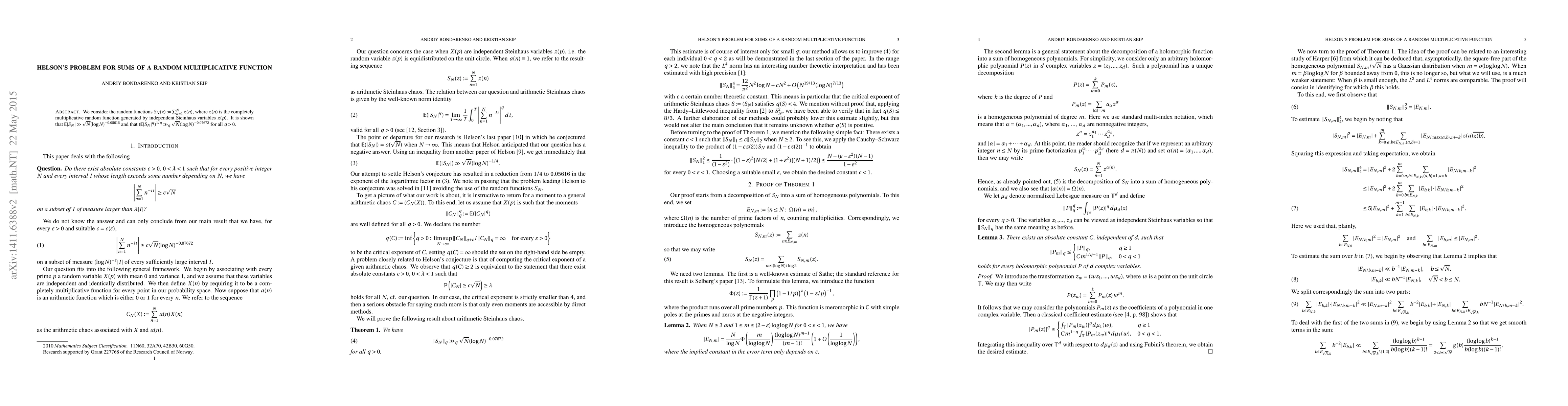 We consider the random functions $S_N(z):=\sum_{n=1}^N z(n) $, where $z(n)$ is the completely multiplicative random function generated by independent Steinhaus variables $z(p)$. It is shown that ${\Bbb E} |S_N|\gg \sqrt{N}(\log N)^{-0.05616}$ and that $({\Bbb E} |S_N|^q)^{1/q}\gg_{q} \sqrt{N}(\log N)^{-0.07672}$ for all $q>0$.