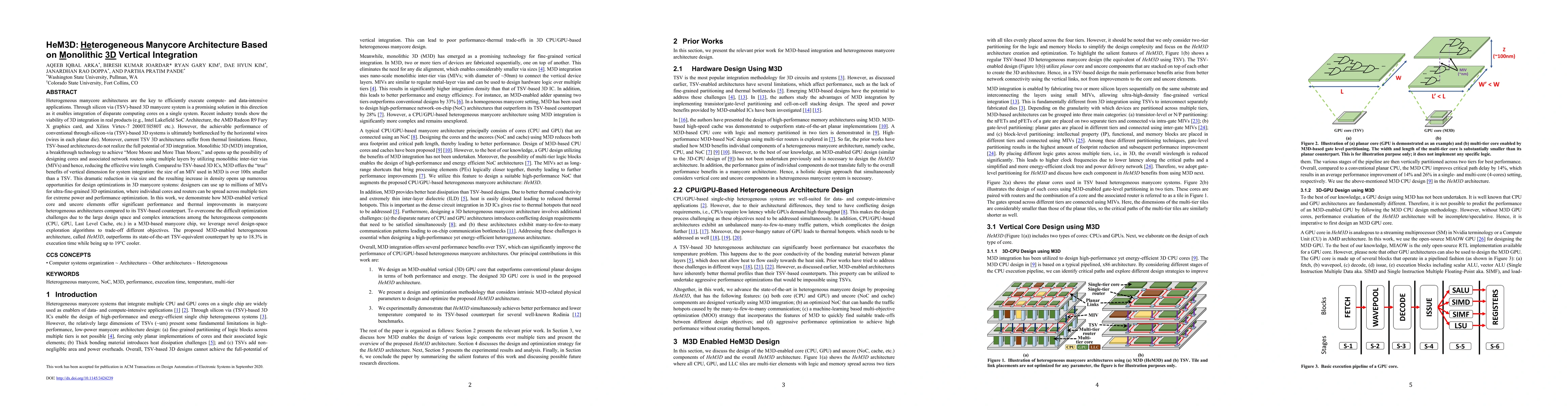 HeM3D presents a monolithic 3D (M3D) vertical integration approach for heterogeneous manycore architectures, achieving significant performance and thermal improvements over traditional TSV-based 3D systems. The M3D method leverages smaller inter-tier vias to reduce wire length, enabling up to 18.3% faster execution and a 19°C cooler operation compared to TSV-based designs.
