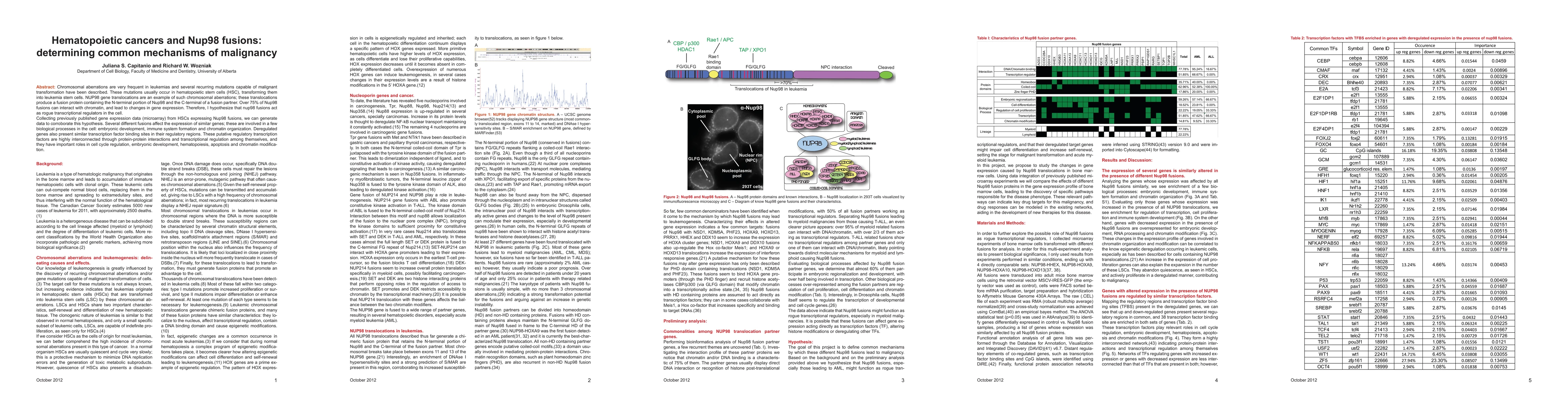 This research investigates the role of Nup98 gene fusions in the malignancy of hematopoietic cancers, hypothesizing they act as rogue transcriptional regulators. Analysis of gene expression data reveals that multiple Nup98 fusions deregulate genes involved in embryonic development, immune system formation, and chromatin organization, suggesting common mechanisms of malignancy.