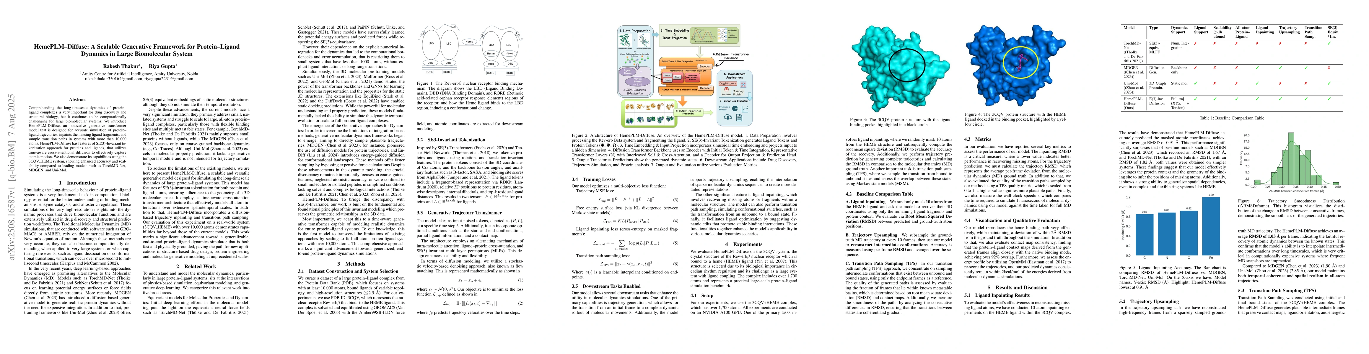 Comprehending the long-timescale dynamics of protein-ligand complexes is very important for drug discovery and structural biology, but it continues to be computationally challenging for large biomolecular systems. We introduce HemePLM-Diffuse, an innovative generative transformer model that is designed for accurate simulation of protein-ligand trajectories, inpaints the missing ligand fragments, and sample transition paths in systems with more than 10,000 atoms. HemePLM-Diffuse has features of SE(3)-Invariant tokenization approach for proteins and ligands, that utilizes time-aware cross-attentional diffusion to effectively capture atomic motion. We also demonstrate its capabilities using the 3CQV HEME system, showing enhanced accuracy and scalability compared to leading models such as TorchMD-Net, MDGEN, and Uni-Mol.