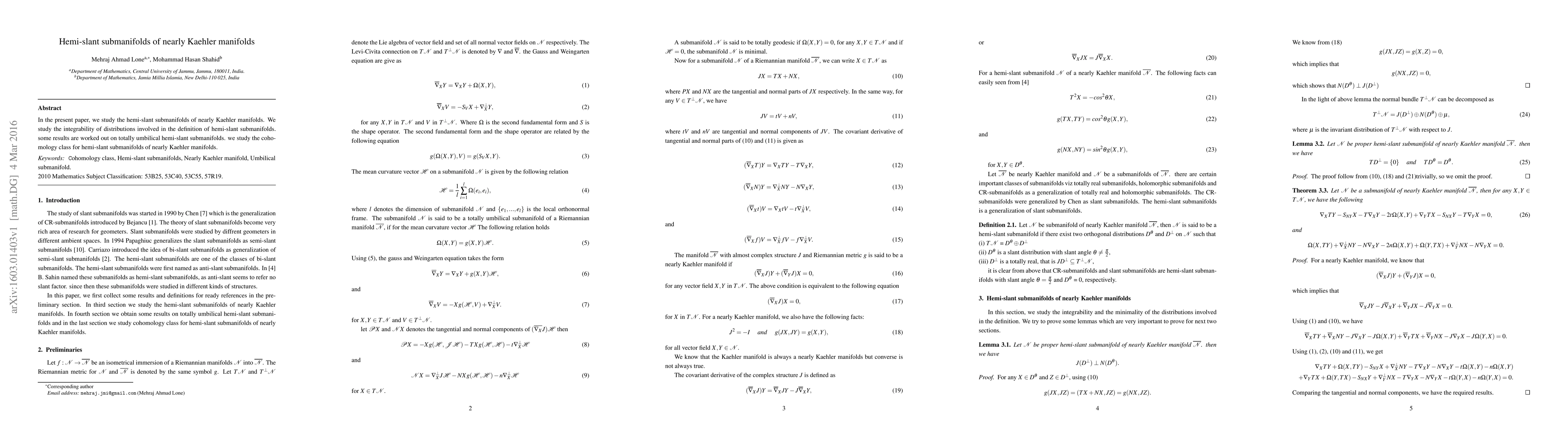 This paper investigates hemi-slant submanifolds within nearly Kähler manifolds, focusing on the integrability of their defining distributions and exploring the cohomology class. Special attention is given to totally umbilical hemi-slant submanifolds.