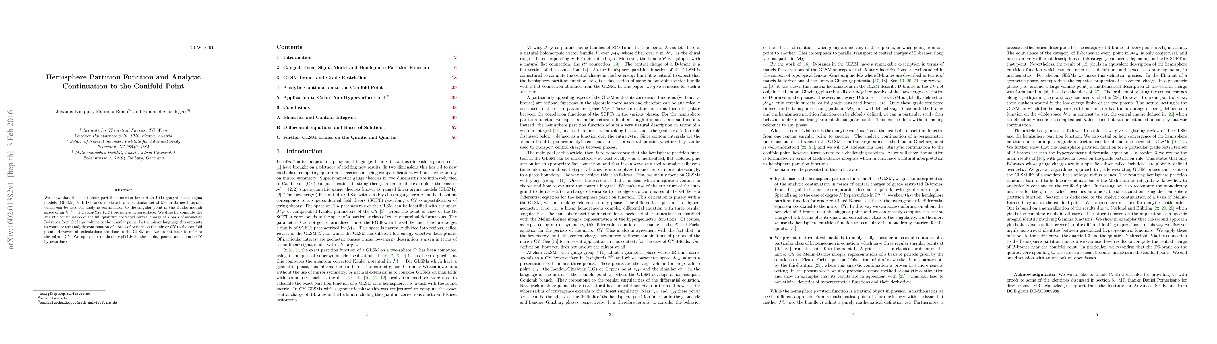 We show that the hemisphere partition function for certain U(1) gauged linear sigma models (GLSMs) with D-branes is related to a particular set of Mellin-Barnes integrals which can be used for analytic continuation to the singular point in the K\"ahler moduli space of an $h^{1,1}=1$ Calabi-Yau (CY) projective hypersurface. We directly compute the analytic continuation of the full quantum corrected central charge of a basis of geometric D-branes from the large volume to the singular point. In the mirror language this amounts to compute the analytic continuation of a basis of periods on the mirror CY to the conifold point. However, all calculations are done in the GLSM and we do not have to refer to the mirror CY. We apply our methods explicitly to the cubic, quartic and quintic CY hypersurfaces.