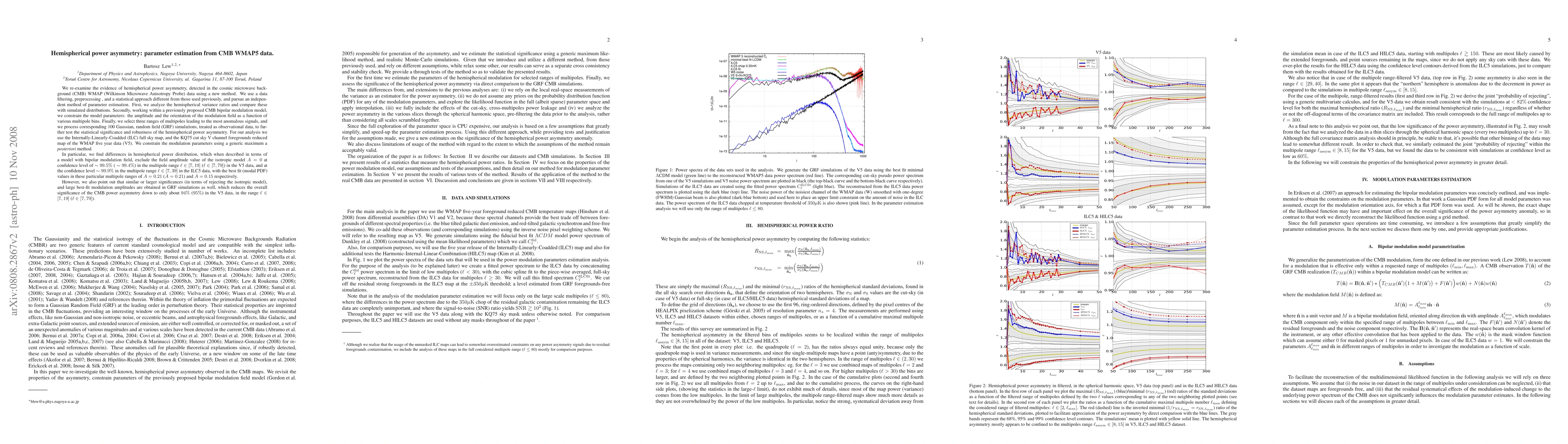 This paper reexamines the hemispherical power asymmetry in the CMB using WMAP5 data, employing a new method to analyze variance ratios and constrain parameters of a bipolar modulation model. The results suggest a significant deviation from an isotropic model, but simulations of Gaussian random fields reduce the overall confidence in the asymmetry to about 94-95%.