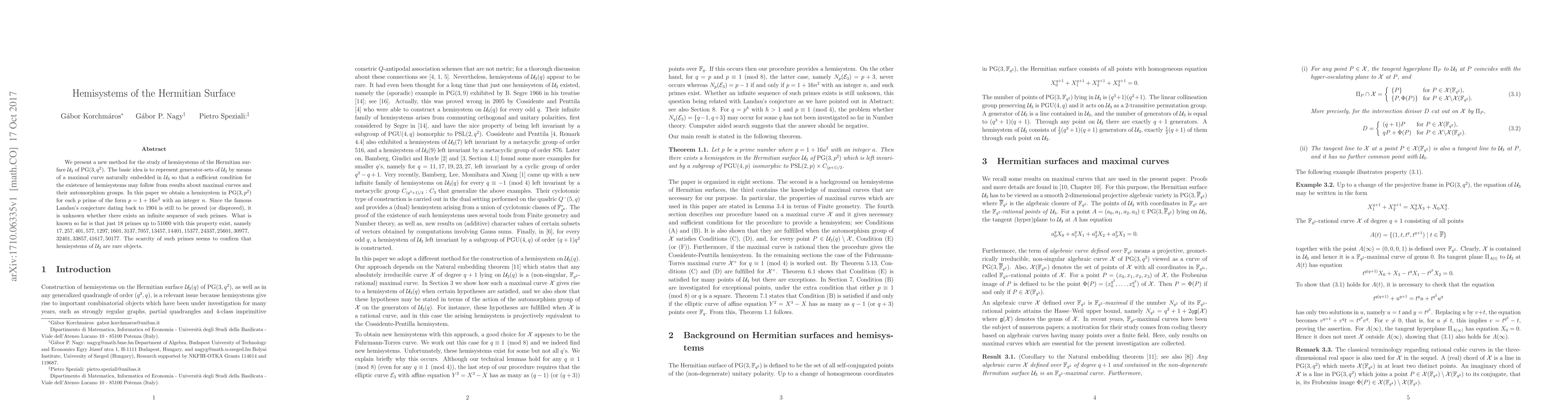 We present a new method for the study of hemisystems of the Hermitian surface $\mathcal{U}_3$ of $PG(3,q^2)$. The basic idea is to represent generator-sets of $\mathcal{U}_3$ by means of a maximal curve naturally embedded in $\mathcal{U}_3$ so that a sufficient condition for the existence of hemisystems may follow from results about maximal curves and their automorphism groups. In this paper we obtain a hemisystem in $\ PG(3,p^2)$ for each $p$ prime of the form $p=1+16n^2$ with an integer $n$. Since the famous Landau's conjecture dating back to 1904 is still to be proved (or disproved), it is unknown whether there exists an infinite sequence of such primes. What is known so far is that just $18$ primes up to $51000$ with this property exist, namely $17,257,401,577, 1297,1601, 3137, 7057,13457,14401,15377,24337,25601,30977,$ $ 32401,33857,41617,50177.$ The scarcity of such primes seems to confirm that hemisystems of $\mathcal{U}_3$ are rare objects.