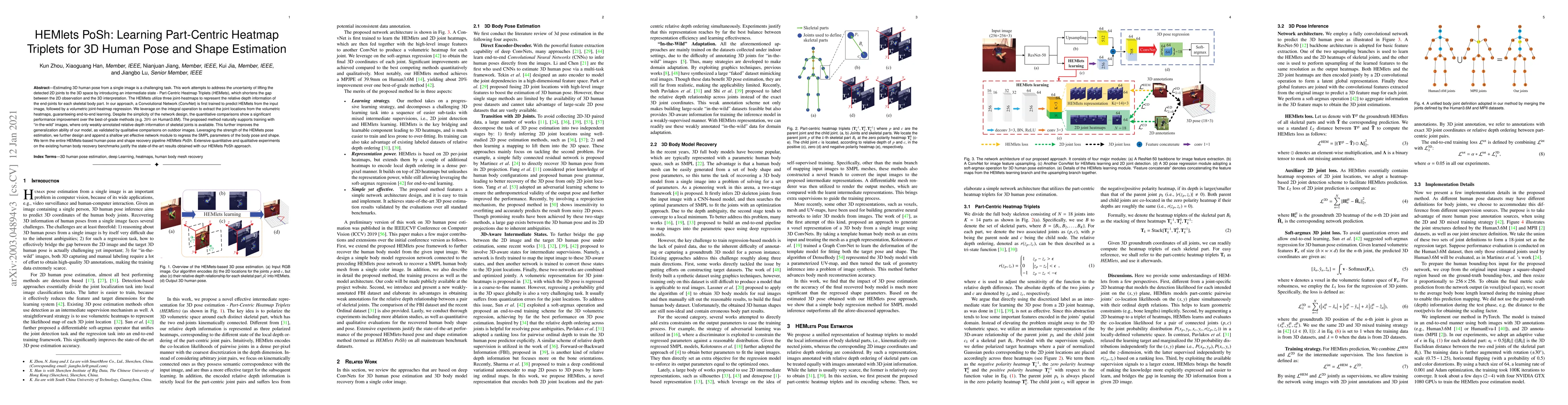 Estimating 3D human pose from a single image is a challenging task. This work attempts to address the uncertainty of lifting the detected 2D joints to the 3D space by introducing an intermediate state-Part-Centric Heatmap Triplets (HEMlets), which shortens the gap between the 2D observation and the 3D interpretation. The HEMlets utilize three joint-heatmaps to represent the relative depth information of the end-joints for each skeletal body part. In our approach, a Convolutional Network (ConvNet) is first trained to predict HEMlets from the input image, followed by a volumetric joint-heatmap regression. We leverage on the integral operation to extract the joint locations from the volumetric heatmaps, guaranteeing end-to-end learning. Despite the simplicity of the network design, the quantitative comparisons show a significant performance improvement over the best-of-grade methods (e.g. $20\%$ on Human3.6M). The proposed method naturally supports training with "in-the-wild" images, where only weakly-annotated relative depth information of skeletal joints is available. This further improves the generalization ability of our model, as validated by qualitative comparisons on outdoor images. Leveraging the strength of the HEMlets pose estimation, we further design and append a shallow yet effective network module to regress the SMPL parameters of the body pose and shape. We term the entire HEMlets-based human pose and shape recovery pipeline HEMlets PoSh. Extensive quantitative and qualitative experiments on the existing human body recovery benchmarks justify the state-of-the-art results obtained with our HEMlets PoSh approach.