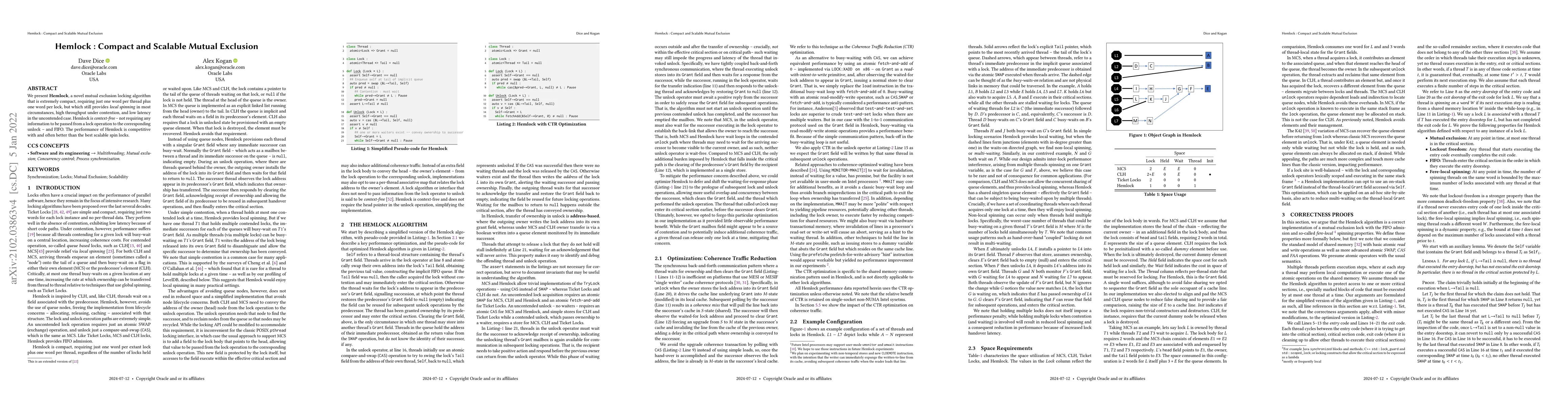 Hemlock is a compact and scalable mutual exclusion algorithm requiring minimal memory per thread and lock, offering local spinning, high throughput, and low latency. It is context-free and FIFO, often outperforming other scalable spin locks in performance.