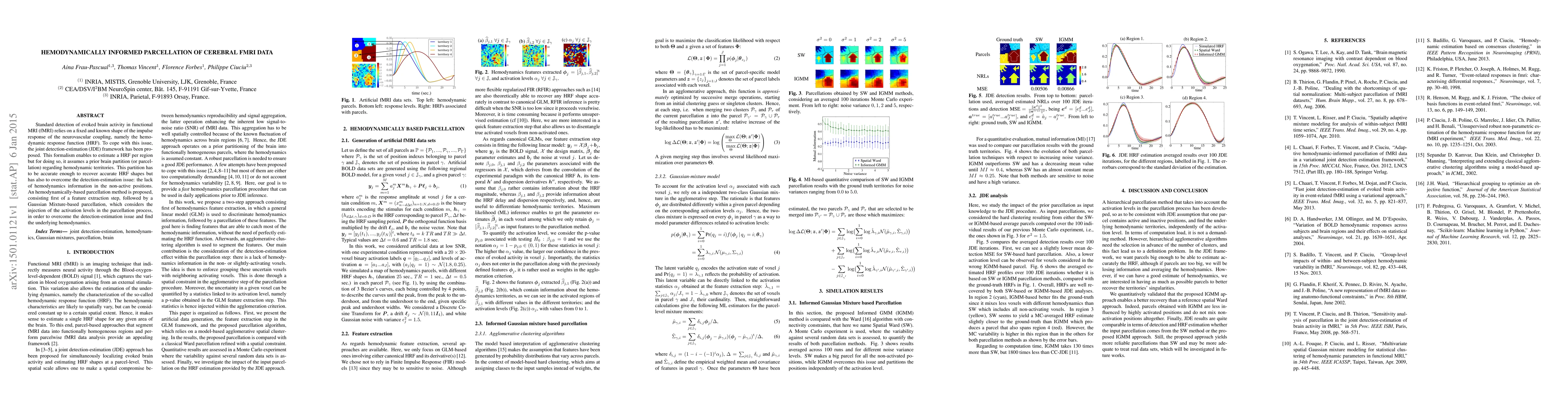 This paper proposes a method for hemodynamically informed parcellation of cerebral fMRI data using a feature extraction step followed by a Gaussian Mixture-based parcellation that incorporates activation levels, aiming to overcome the detection-estimation issue and accurately recover the hemodynamic response function shapes.