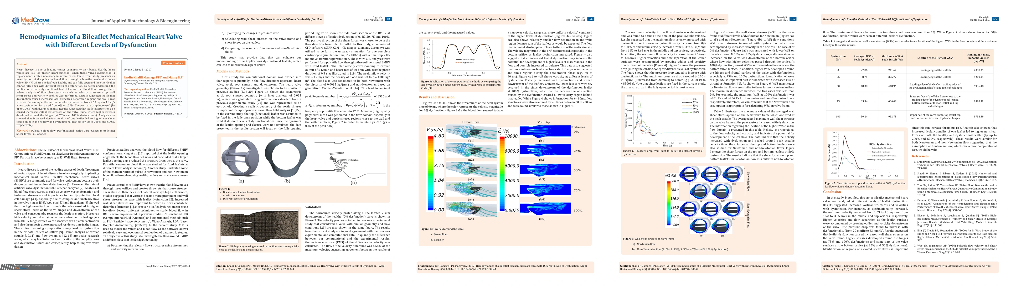 Heart disease is one of leading causes of mortality worldwide. Healthy heart valves are key for proper heart function. When these valves dysfunction, a replacement is often necessary in severe cases. The current study presents an investigation of the pulsatile blood flow through a bileaflet mechanical heart valve (BMHV) where one leaflet is healthy and can fully open and the other leaflet cannot fully open with different levels of dysfunction. To better understand the implications that a dysfunctional leaflet has on the blood flow through these valves, analysis of flow characteristics such as velocity, pressure drop, wall shear stress and vorticity profiles was performed. Results suggested that leaflet dysfunction caused increased local velocities, separation regions and wall shear stresses. For example, the maximum velocity increased from 2.53 m/s to 4.9 m/s when dysfunction increased from 0% to 100%. The pressure drop increased (by up to 300%) with dysfunctionality. Results suggested that leaflet dysfunction also caused increased wall shear stresses on the valve frame where higher stresses developed around the hinges (at 75% and 100% dysfunctions). Analysis also showed that increased dysfunctionality of one leaflet led to higher net shear forces on both the healthy and dysfunctional leaflets (by up to 200% and 600%, respectively).