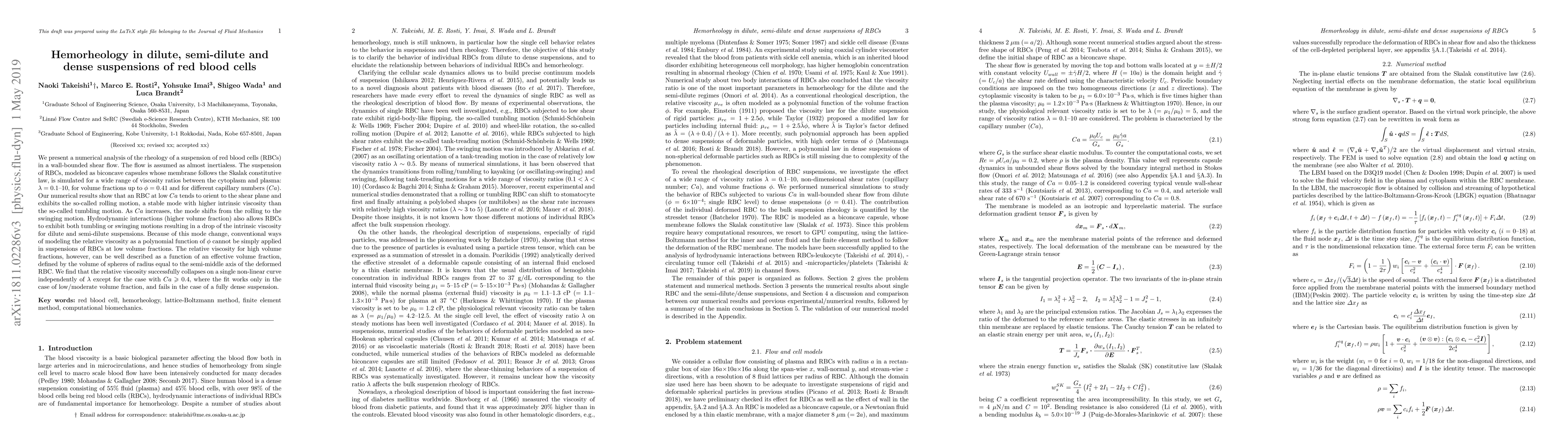 This paper numerically analyzes the rheology of red blood cell suspensions under wall-bounded shear flow, showing that RBCs exhibit rolling and swinging motions depending on capillary number and volume fraction. Conventional viscosity models fail for low volume fractions due to mode changes, but high volume fractions can be modeled using an effective volume fraction.