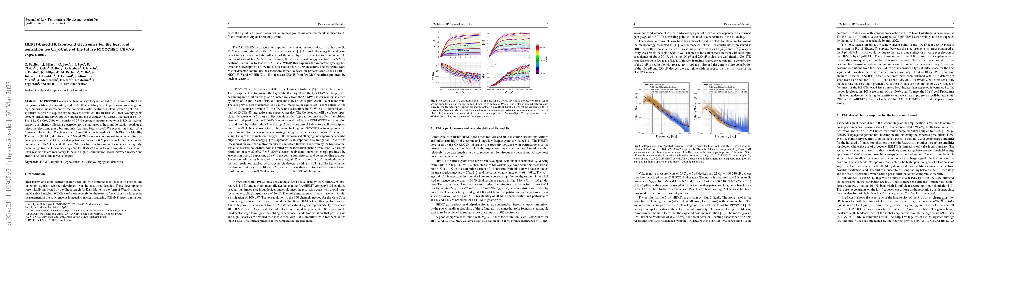 The RICOCHET experiment aims to measure the coherent elastic neutrino-nucleus scattering spectrum using a 1 kg Ge CryoCube detector array. The front-end electronics utilize HEMT-based amplification at 1K to achieve ultra-low noise, achieving 10 eV heat and 20 eVee RMS resolutions, essential for distinguishing nuclear and electron recoils.