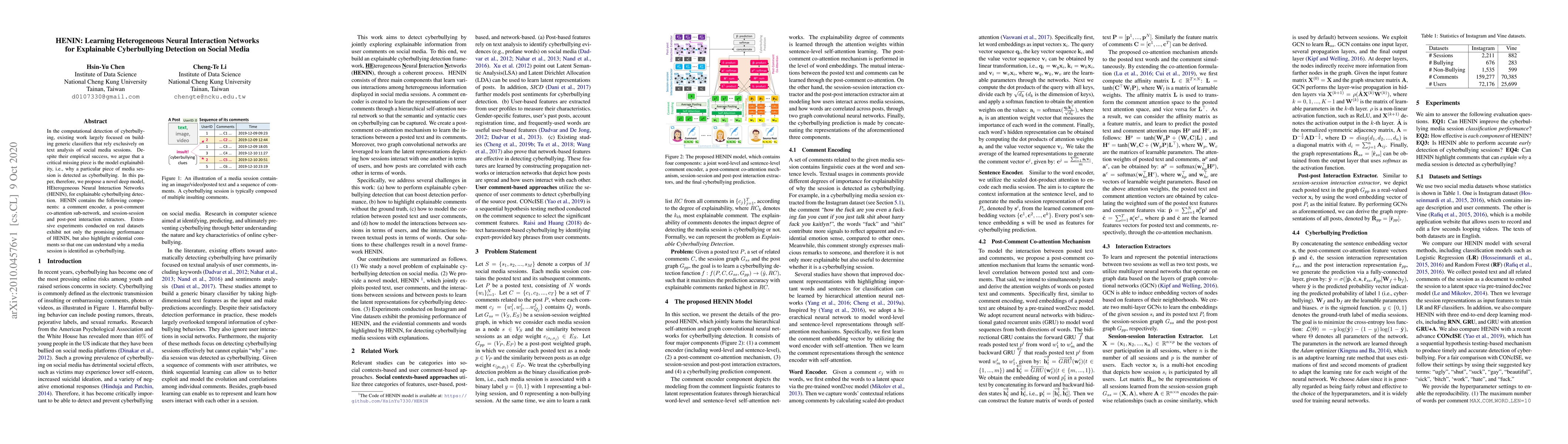 This paper proposes HENIN, a novel deep model for explainable cyberbullying detection on social media, addressing the lack of model explainability in existing text-based classifiers. HENIN includes a comment encoder, co-attention sub-network, and interaction extractors, demonstrating promising performance and providing insights into detections.