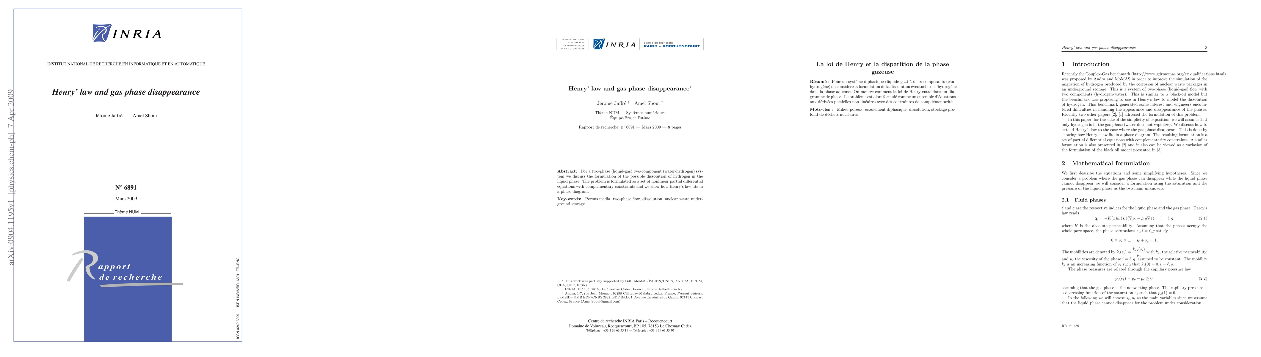 For a two-phase (liquid-gas) two-component (water-hydrogen) system in porous media we discuss the formulation of the possible dissolution of hydrogen in the liquid phase. We show how Henry's law fits in a phase diagram. Then the problem is formulated as a set of nonlinear partial differential equations with complementarity constraints.