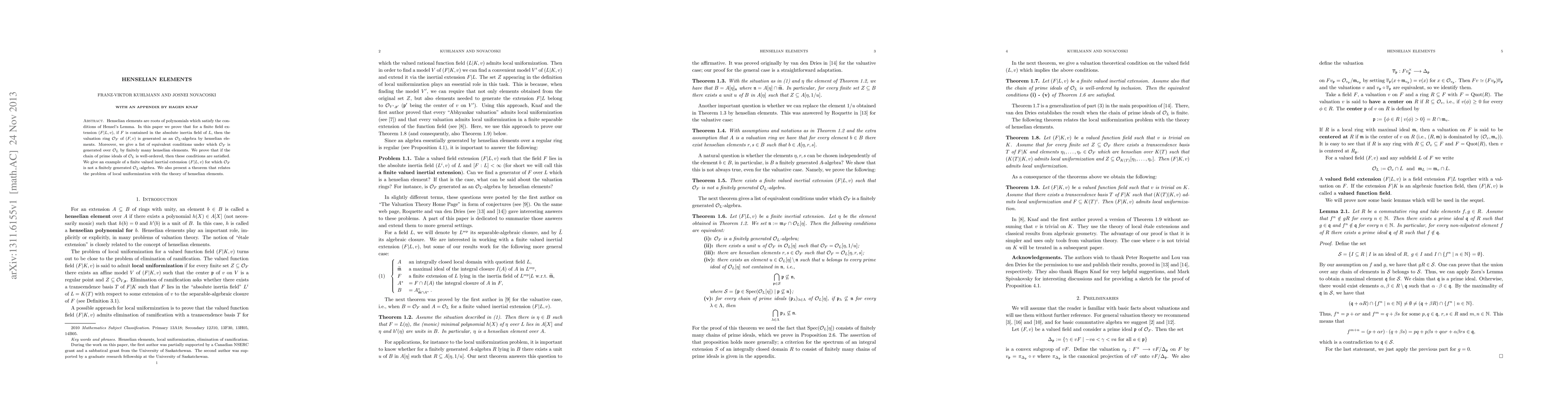 Henselian elements are roots of polynomials which satisfy the conditions of Hensel's Lemma. In this paper we prove that for a finite field extension $(F|L,v)$, if $F$ is contained in the absolute inertia field of $L$, then the valuation ring $\mathcal O_F$ of $(F,v)$ is generated as an $\mathcal O_L$-algebra by henselian elements. Moreover, we give a list of equivalent conditions under which $\mathcal O_F$ is generated over $\mathcal O_L$ by finitely many henselian elements. We prove that if the chain of prime ideals of $\mathcal O_L$ is well-ordered, then these conditions are satisfied. We give an example of a finite valued inertial extension $(F|L,v)$ for which $\mathcal O_F$ is not a finitely generated $\mathcal O_L$-algebra. We also present a theorem that relates the problem of local uniformization with the theory of henselian elements.