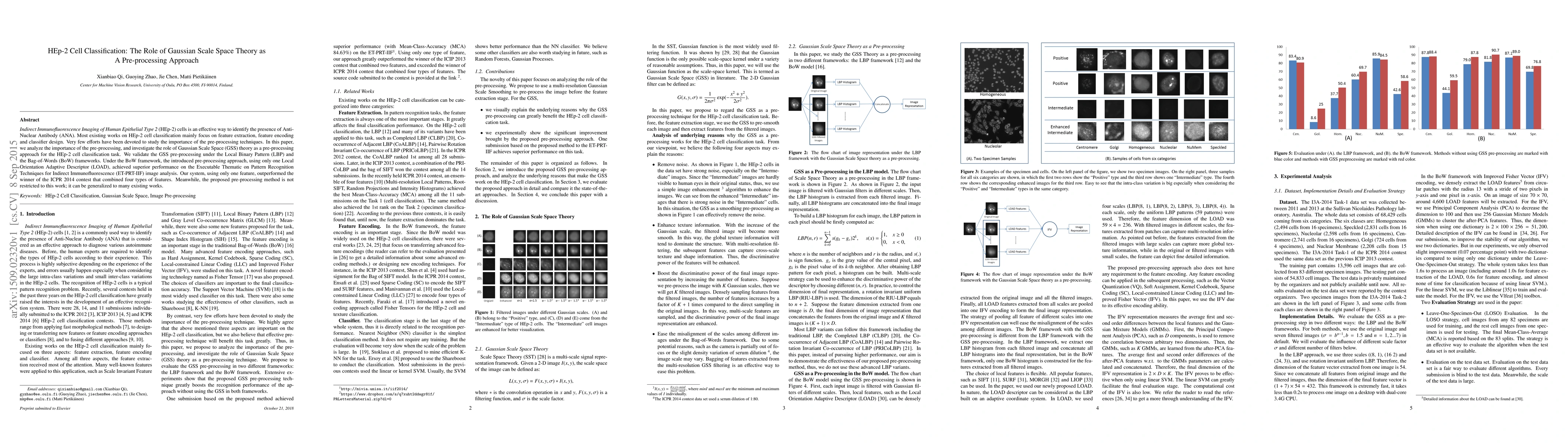 This paper explores the significance of pre-processing techniques in HEp-2 cell classification using Gaussian Scale Space (GSS) theory, demonstrating superior performance under Local Binary Pattern (LBP) and Bag-of-Words (BoW) frameworks. The GSS pre-processing, utilizing a single Local Orientation Adaptive Descriptor (LOAD), outperformed the ICPR 2014 contest winner, which used four feature types.