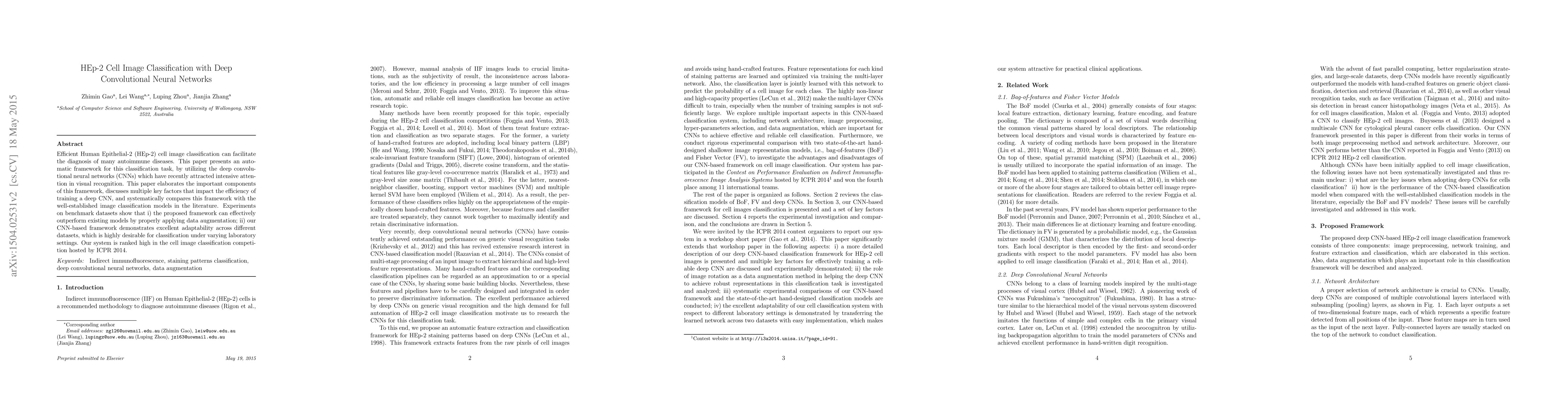This paper proposes a deep convolutional neural network (CNN) framework for efficient HEp-2 cell image classification to aid in diagnosing autoimmune diseases. The framework outperforms existing models through data augmentation and demonstrates adaptability across various datasets, achieving high rankings in a cell image classification competition.