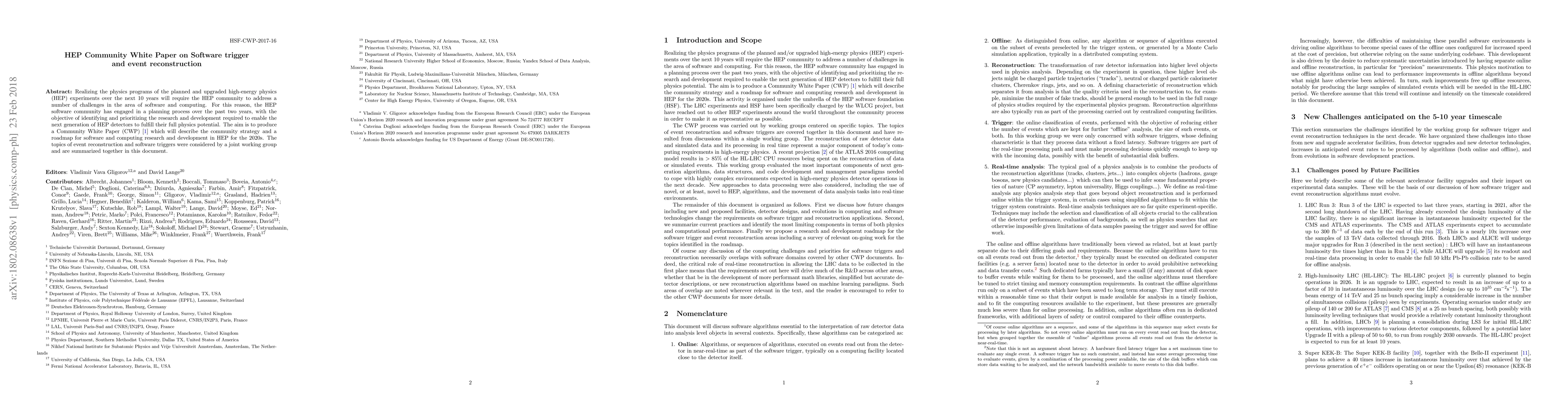 The HEP Community White Paper outlines the strategies and roadmap for software and computing research needed for next-generation high-energy physics detectors, focusing on event reconstruction and software triggers to fulfill the physics goals of upcoming experiments. It prioritizes the R&D required to meet these challenges over the next decade.
