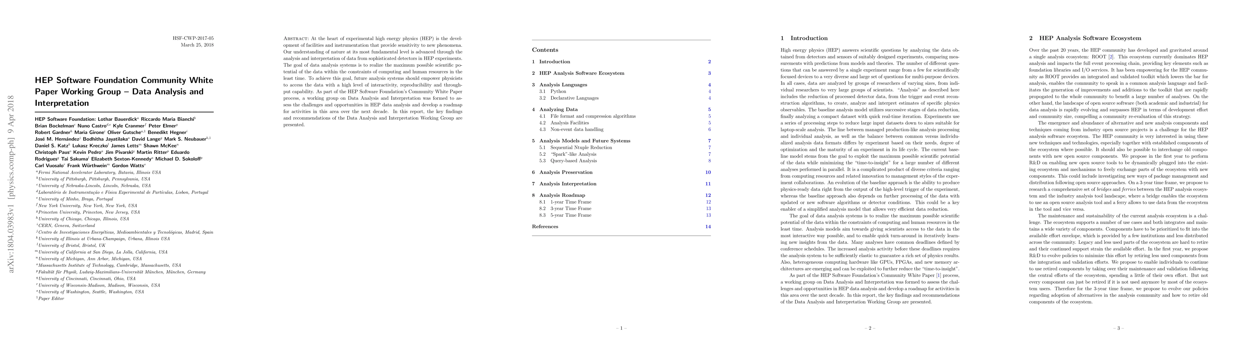The HEP Software Foundation Community White Paper Working Group on Data Analysis and Interpretation focuses on maximizing the scientific potential of high energy physics data through advanced analysis systems, emphasizing interactivity, reproducibility, and throughput. The group's report outlines challenges and proposes a roadmap for data analysis advancements over the next decade.