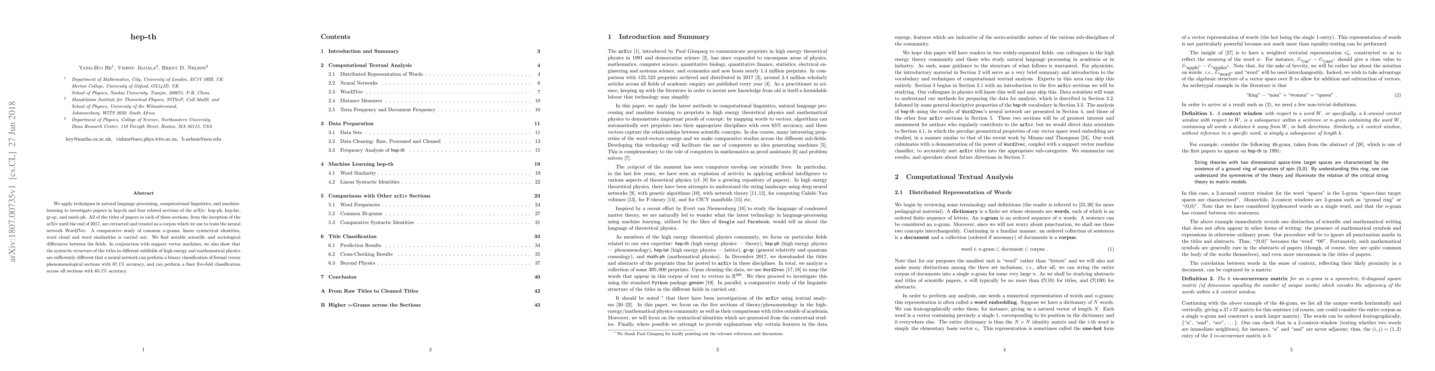 We apply techniques in natural language processing, computational linguistics, and machine-learning to investigate papers in hep-th and four related sections of the arXiv: hep-ph, hep-lat, gr-qc, and math-ph. All of the titles of papers in each of these sections, from the inception of the arXiv until the end of 2017, are extracted and treated as a corpus which we use to train the neural network Word2Vec. A comparative study of common n-grams, linear syntactical identities, word cloud and word similarities is carried out. We find notable scientific and sociological differences between the fields. In conjunction with support vector machines, we also show that the syntactic structure of the titles in different sub-fields of high energy and mathematical physics are sufficiently different that a neural network can perform a binary classification of formal versus phenomenological sections with 87.1% accuracy, and can perform a finer five-fold classification across all sections with 65.1% accuracy.