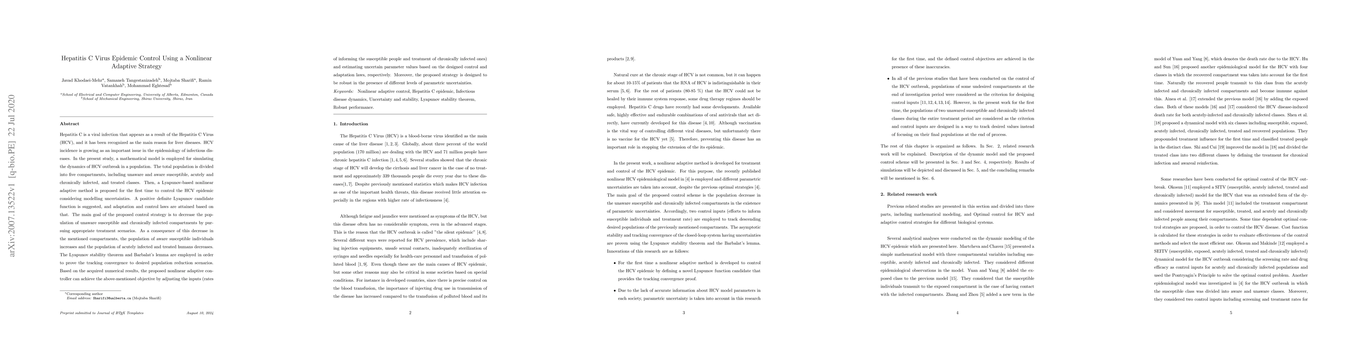 This study proposes a Lyapunov-based nonlinear adaptive control strategy to manage the Hepatitis C Virus (HCV) epidemic by reducing unaware susceptible and chronically infected populations through informed interventions and treatment. The adaptive control adjusts treatment rates and information dissemination while accounting for modeling uncertainties, achieving stability and convergence to desired population reduction scenarios.