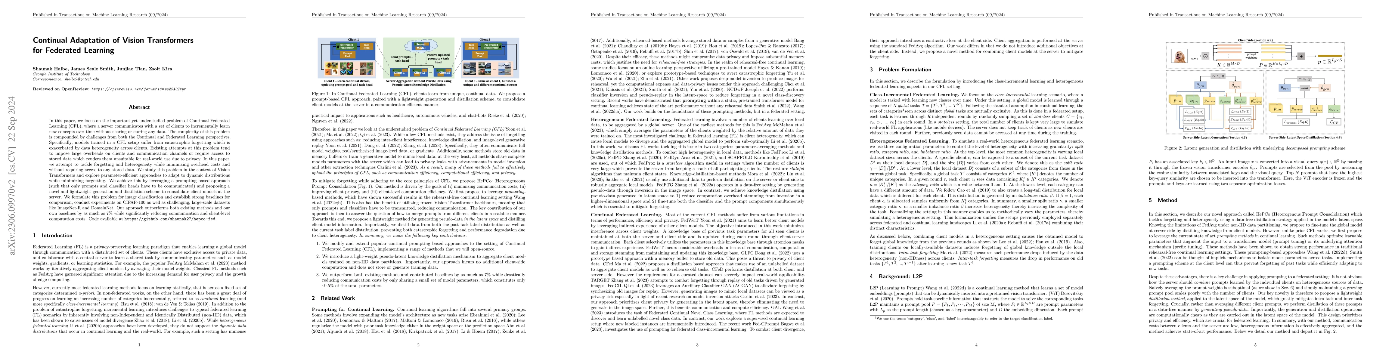 In this paper, we focus on the important yet understudied problem of Continual Federated Learning (CFL), where a server communicates with a set of clients to incrementally learn new concepts over time without sharing or storing any data. The complexity of this problem is compounded by challenges from both the Continual and Federated Learning perspectives. Specifically, models trained in a CFL setup suffer from catastrophic forgetting which is exacerbated by data heterogeneity across clients. Existing attempts at this problem tend to impose large overheads on clients and communication channels or require access to stored data which renders them unsuitable for real-world use due to privacy. In this paper, we attempt to tackle forgetting and heterogeneity while minimizing overhead costs and without requiring access to any stored data. We achieve this by leveraging a prompting based approach (such that only prompts and classifier heads have to be communicated) and proposing a novel and lightweight generation and distillation scheme to consolidate client models at the server. We formulate this problem for image classification and establish strong baselines for comparison, conduct experiments on CIFAR-100 as well as challenging, large-scale datasets like ImageNet-R and DomainNet. Our approach outperforms both existing methods and our own baselines by as much as 7% while significantly reducing communication and client-level computation costs.